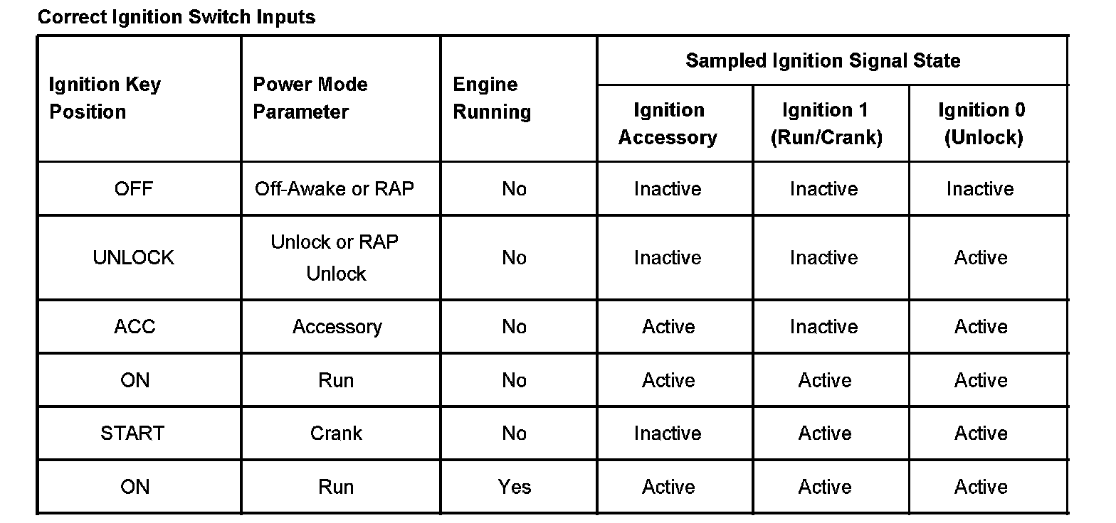On vehicles that have several control modules connected by serial data circuits, one module is the power mode master (PMM). On this vehicle the PMM is the Body Control Module (BCM). The BCM uses 3 signals from the ignition switch. These are the Ignition 0 (Unlock), Ignition 1 (Run/Crank), and Accessory.