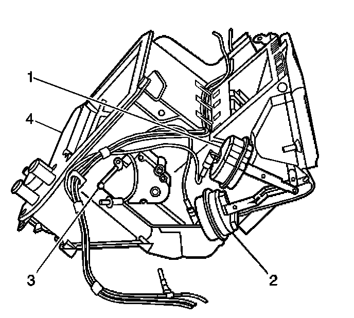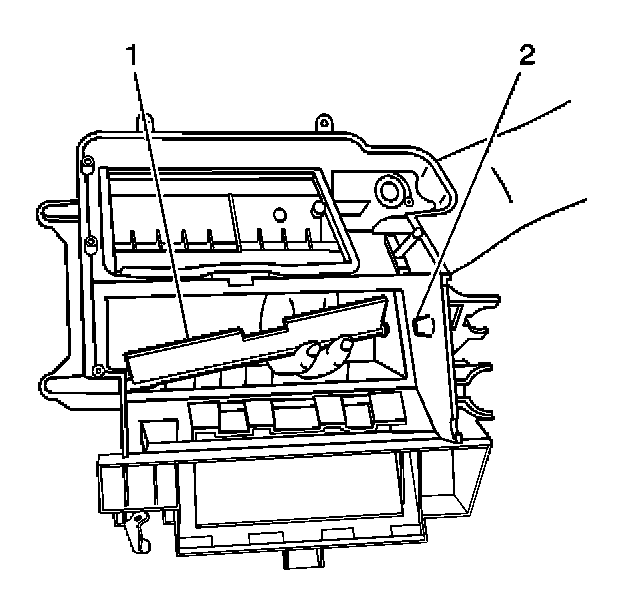 7. Remove the lower mode door (1) to the heater assembly (2).