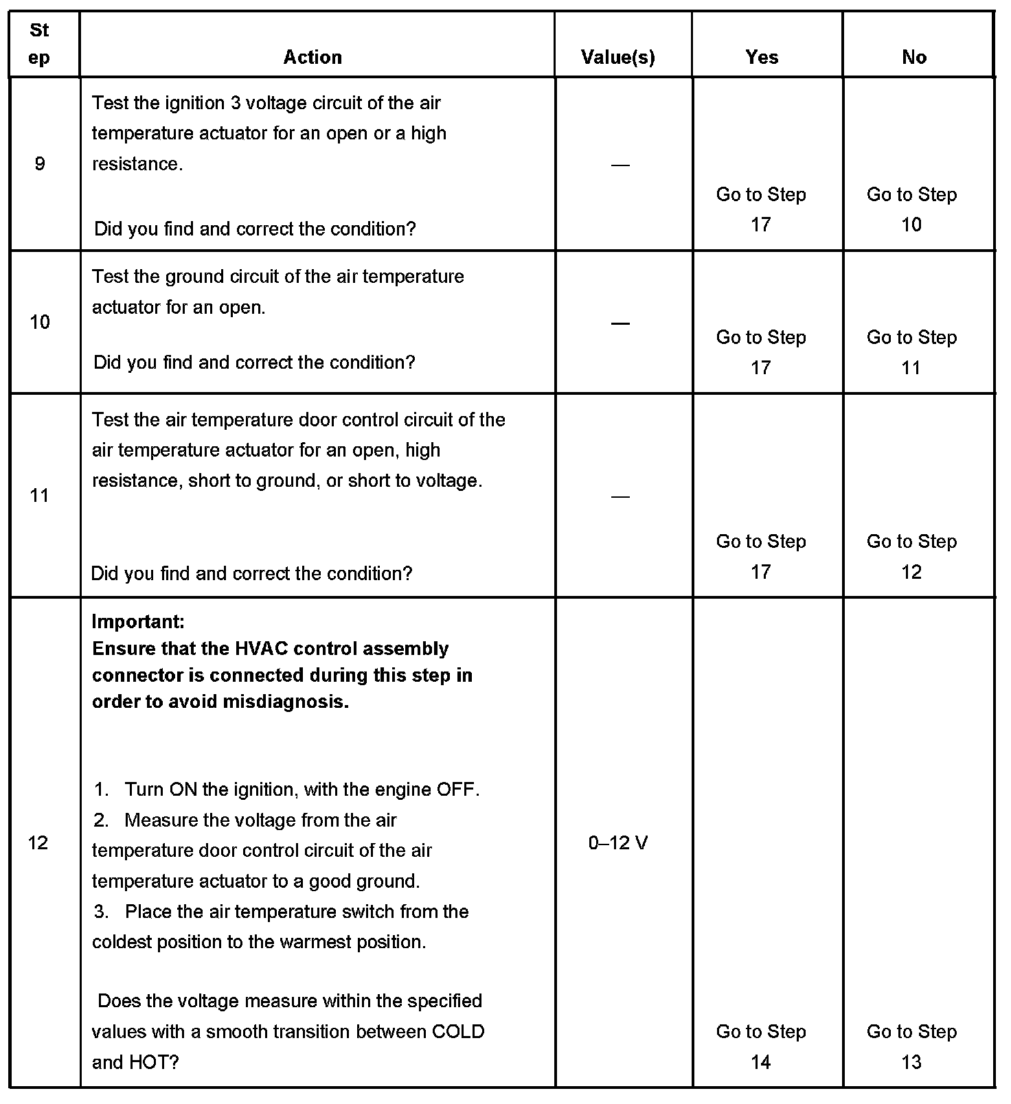 12. The voltage will vary between 0-12 volts during normal operation. The HVAC control assembly connector must be connected during this step.
