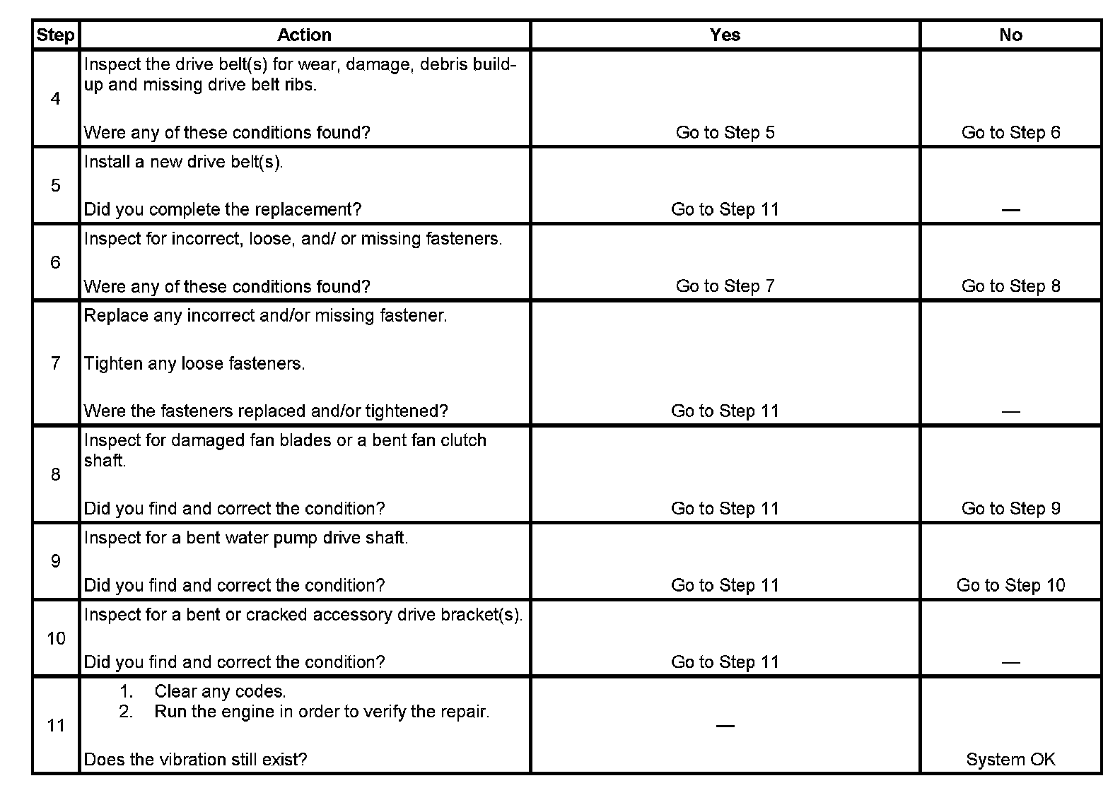 8. This step should only be performed if the fan is driven by the drive belt. Inspect the engine cooling fan for bent, twisted, loose, or cracked blades. Inspect the fan clutch for smooth operation. Inspect for a bent fan shaft or bent mounting flange.
