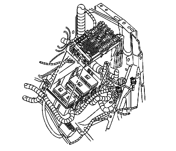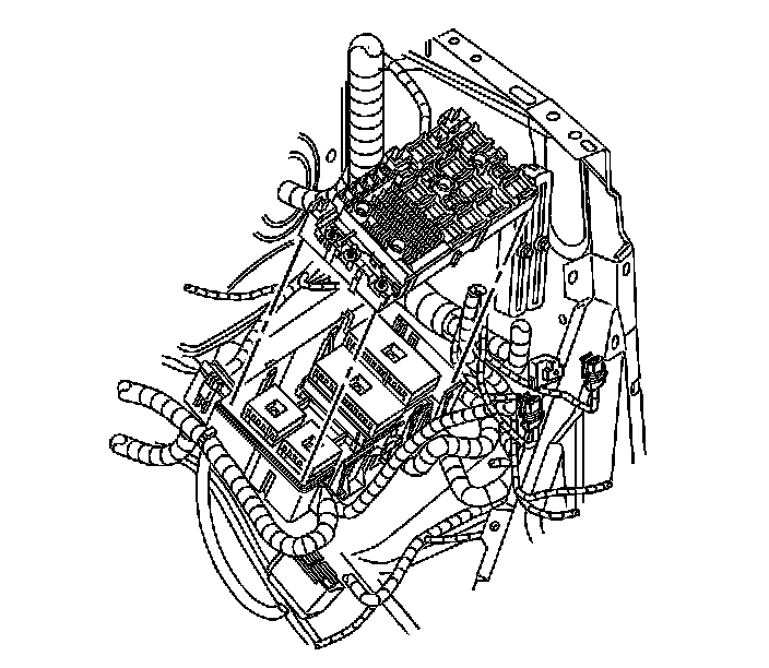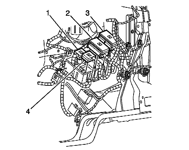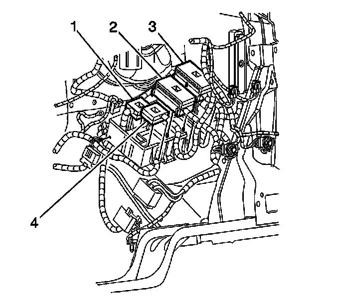 5. Remove from the junction block base the Chassis Harness (1), the I/P Harness (2), the Engine Harness (3), and the Forward LP Harness (4).