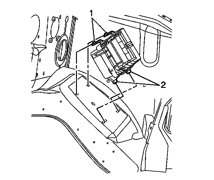 6. Remove the junction block base by pressing tabs (1) then slide tabs (2) out.