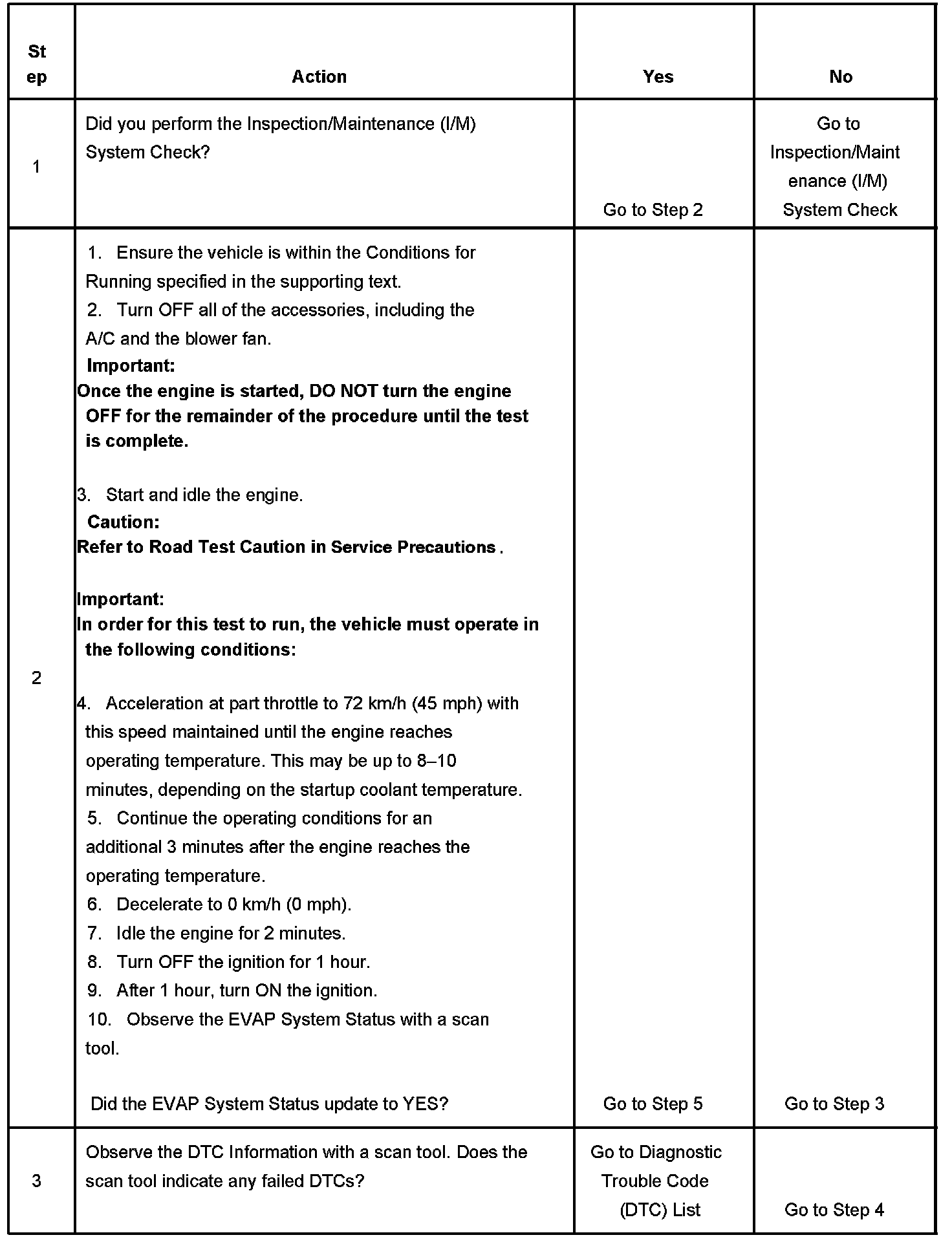 The purpose of this test is to satisfy the enable criteria necessary in order to execute the inspection/maintenance (I/M) readiness diagnostics for the evaporative emission (EVAP) system. The test may be used in order to set the I/M System Status indicators to YES. The I/M System Status Display on the scan tool provides an indication of when the control module has completed the required tests. The I/M System Status does not indicate that the tests have passed or failed. When all of the diagnostics for a specific system have run and passed and I/M System Status will update to YES. If a test for a specific system has failed, the I/M System Status will update to YES, indicating a determination was made, even if all of the other tests for that system have not run. Performing a visual inspection prior to running the EVAP test may prevent having to repeat the test. A failed or aborted test will require the vehicle to cool down in order to meet the enable criteria to run another test.