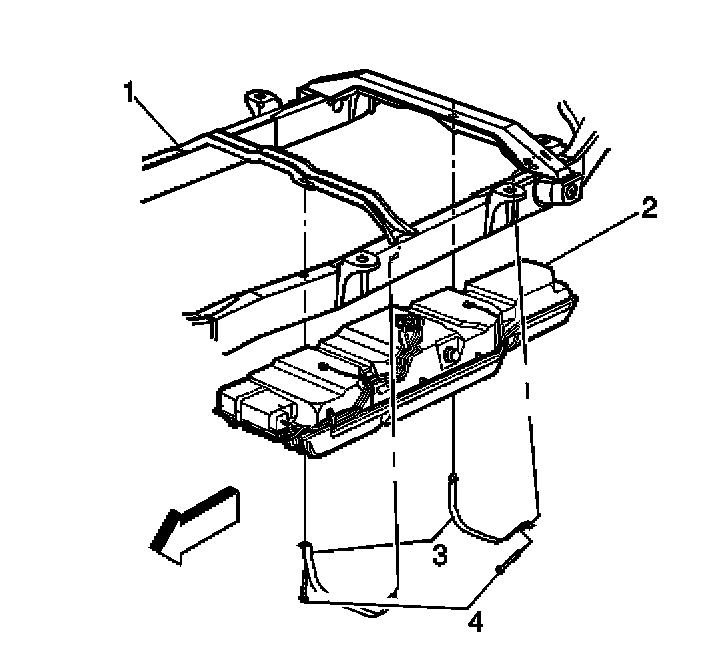 11. Install the new attaching bolts (4) to the fuel tank strap.