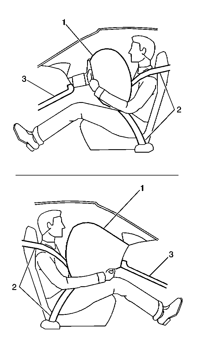 SIR SYSTEM OVERVIEWThe supplemental inflatable restraint (SIR) system supplements the protection offered by the occupant's seat belt system (2). The SIR system may contain several inflator modules located throughout the vehicle, i.e. steering wheel module (1) and instrument panel (I/P) module. Each inflator module has a deployment loop that is controlled by the sensing and diagnostic module (SDM) mounted inside the vehicle. The SDM determines the severity of a collision with the assistance of various sensor inputs. When the SDM detects a collision of sufficient force it will process the information provided by the sensors to further support air bag deployment. The SDM performs continuous diagnostic monitoring of the SIR system electrical components. Upon detection of a circuit malfunction, the SDM will set a DTC and inform the driver by requesting the instrument panel cluster (IPC) to turn the AIR BAG indicator ON. The steering column (1) and knee bolsters (3) are designed to absorb energy and compress during frontal collisions in order to limit leg movement and decrease