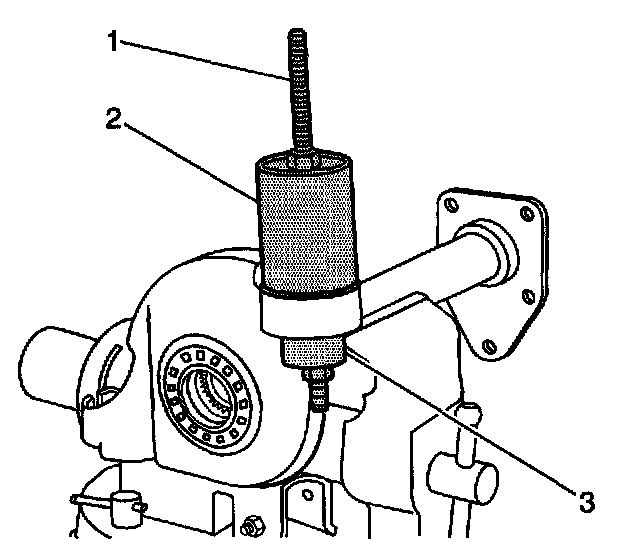 7. Install the J45850-2 (2), J45850-1 (3), the forcing screw, the thrust bearing, the washers, and the nuts (1) over the inner shaft housing bushing as shown.