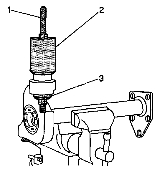 6. Install the J45850-2 (2), J45850-3 (3), the forcing screw, the thrust bearing, the washers, and the nuts (1) over the lower inner shaft housing bushing as shown.