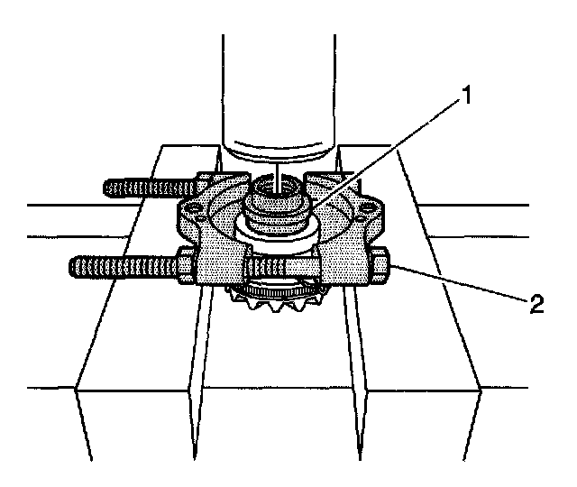 3. Remove the thrust sleeve using the J22912-01 (2) and the J45232 (1), if necessary, and a hydraulic press.