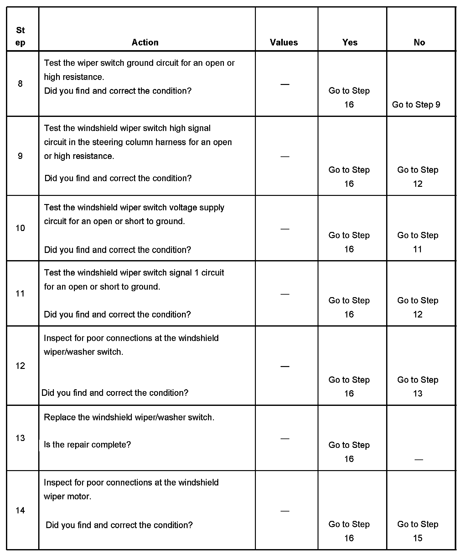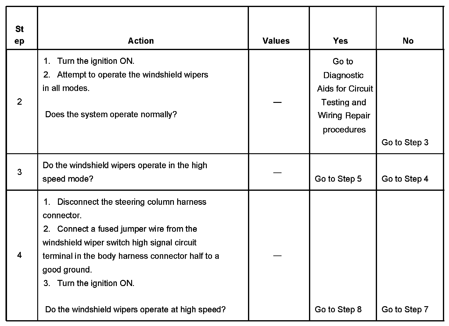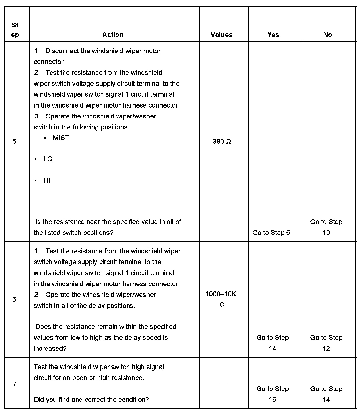6. This step tests for continuity through the delay resistors in the windshield wiper/washer switch. The measured resistance will change in sequence from low to high as the delay speed is increased.