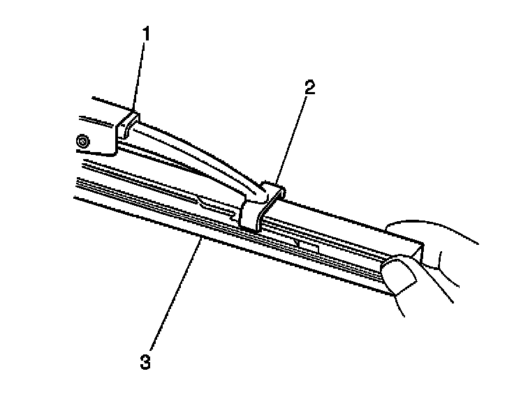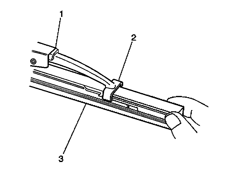 3. Engage the bottom claw (2) of the wiper blade (1) into the notches in wiper blade element (3).