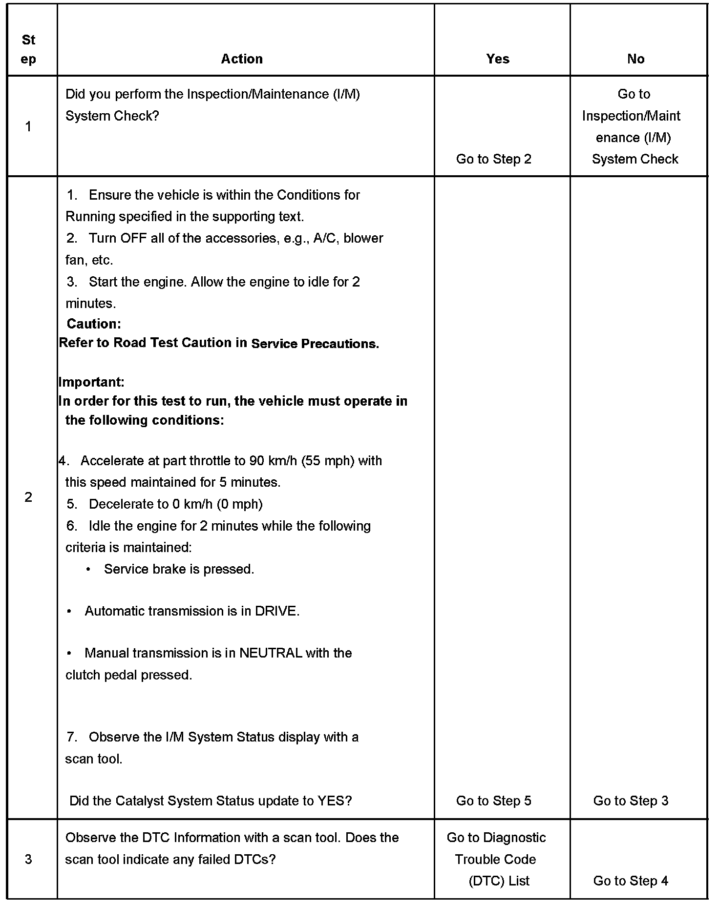 The purpose of this test is to satisfy the enable criteria necessary to execute I/M readiness diagnostics for the Catalyst System. The test may be used to set the I/M System Status indicators to YES.