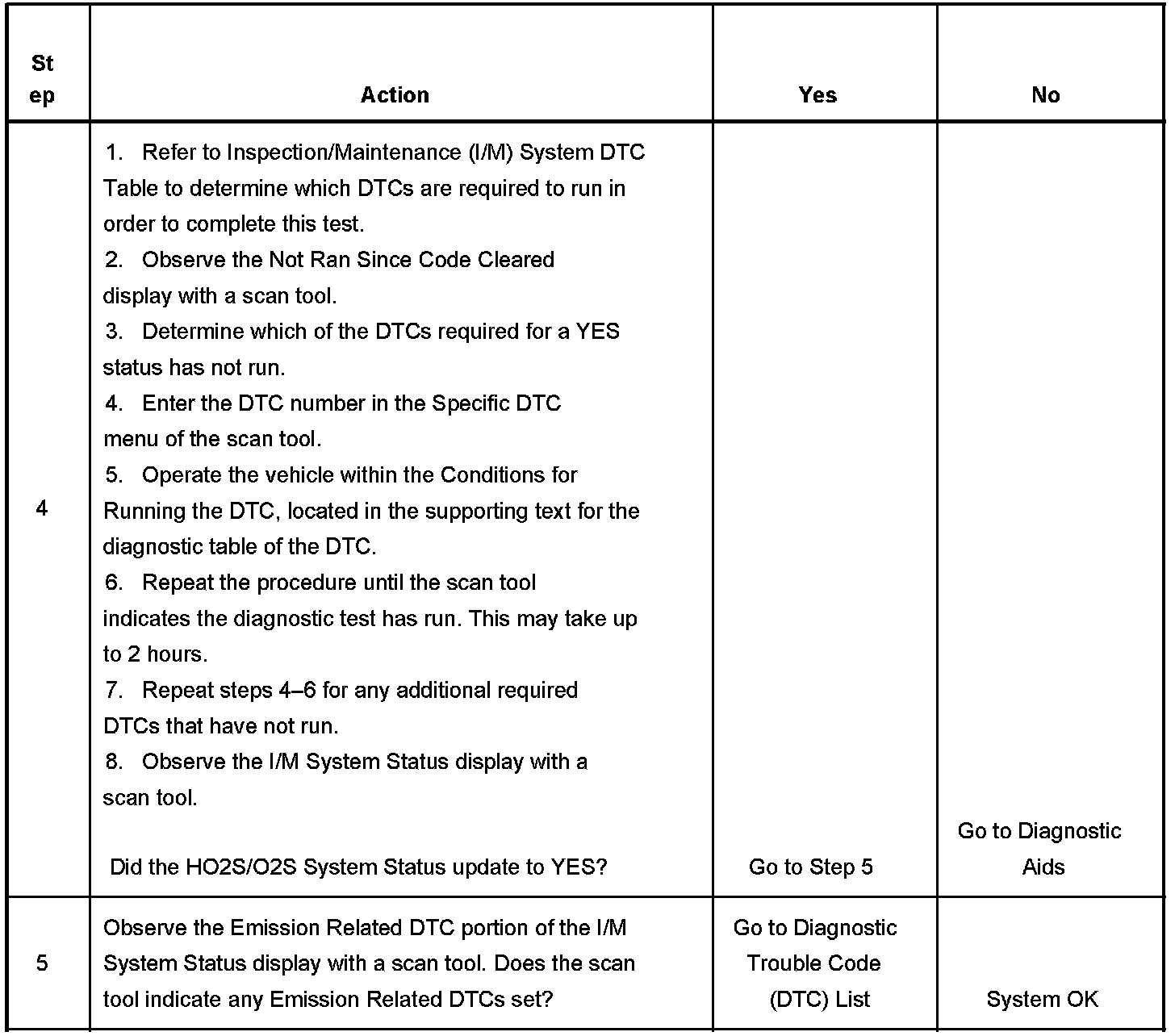 The purpose of this test is to satisfy the enable criteria necessary to execute I/M readiness diagnostics for the Oxygen Sensor (O2S/HO2S) System. The test may be used to set the I/M System Status to YES. The I/M System Status Display on the scan tool provides an indication of whether the control module has completed the required tests. The I/M System Status does not indicate that the tests have passed or failed. When all of the diagnostics for a specific system have run and passed the I/M System Status will update to YES, indicating a determination was made, even if all of the other tests for that system have not run.
