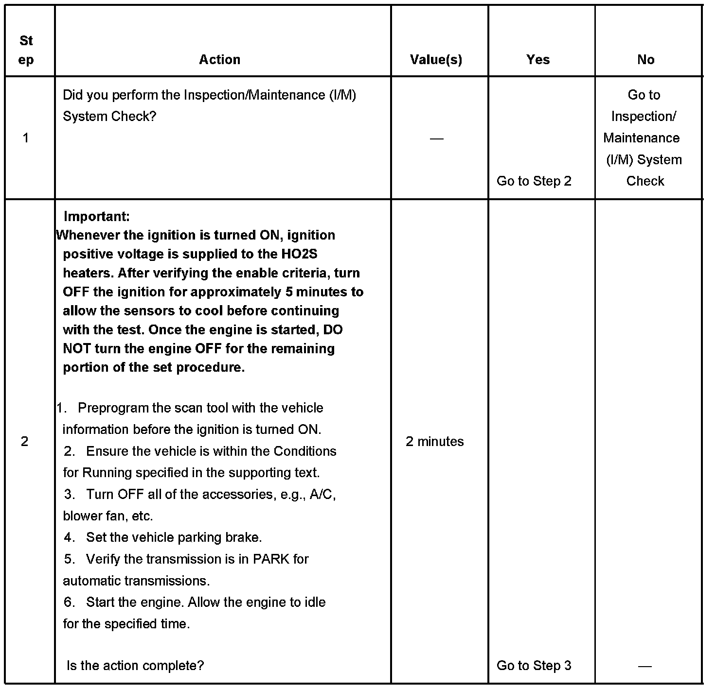 The purpose of the I/M Complete System Set Procedure is to satisfy the enable criteria necessary to execute all of the I/M readiness diagnostics, and complete the trips for those particular diagnostics. When all diagnostic tests are completed, the I/M System Status indicators are set to YES. Perform this test when more than one of the I/M System Status indicators are set to NO.