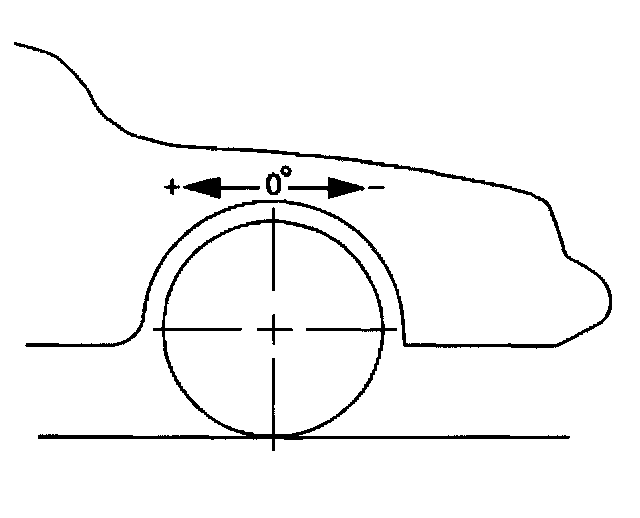 Caster DescriptionCaster is the tilting of the uppermost point of the steering axis either forward or backward, when viewed from the side of the vehicle. A backward tilt is positive (+) and a forward tilt is negative (-). Caster influences directional control of the steering but does not affect the tire wear and is adjustable on this vehicle. Caster is affected by the vehicle height, therefore it is important to keep the body at its designed height. Overloading the vehicle or a weak or sagging rear spring will affect caster. When the rear of the vehicle is lower than its designated trim height, the front suspension moves to a more positive caster. If the rear of the vehicle is higher than its designated trim height, the front suspension moves to a less positive caster.