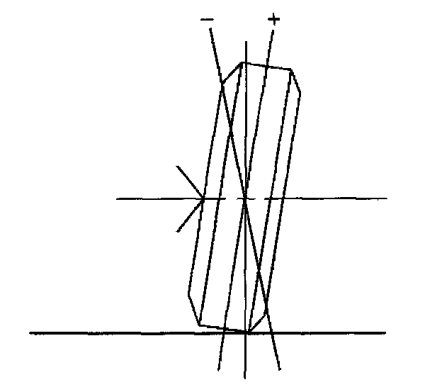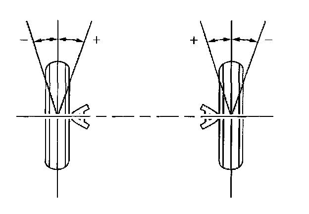 Camber is the tilting of the wheels from the vertical when viewed from the front of the vehicle. When the wheels tilt outward at the top, the camber is positive (+). When the wheel tilts inward at the top, the camber is negative (-). The amount of tilt is measured in degrees from the vertical. Camber settings influence the directional control and the tire wear.