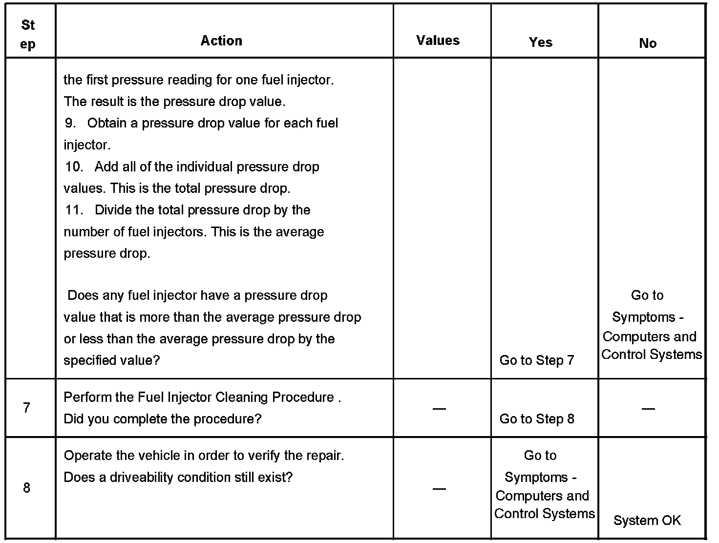 6. If the pressure drop value for each fuel injector is within 10 kPa (1.5 psi) of the average pressure drop value, the fuel injectors are flowing properly.