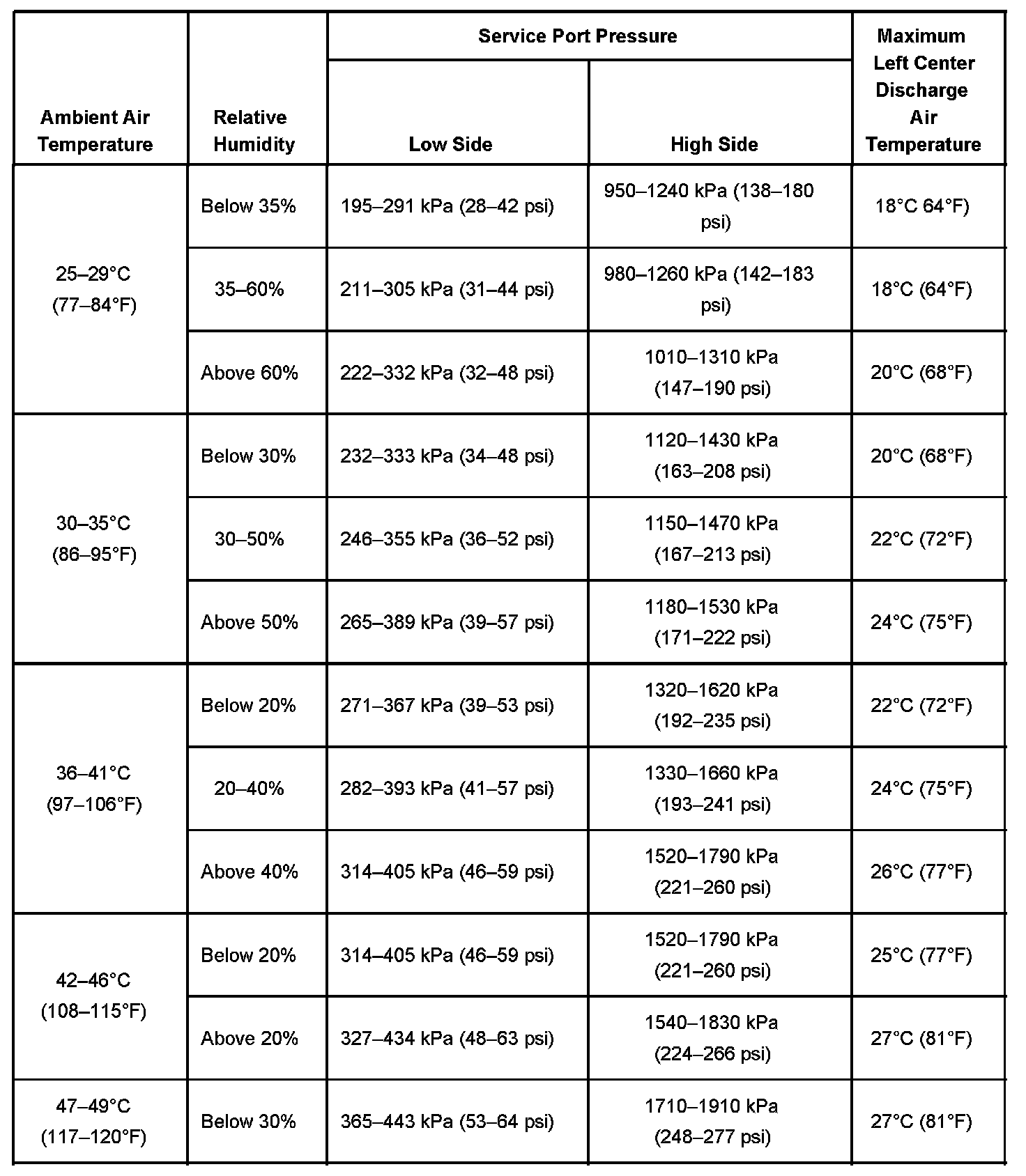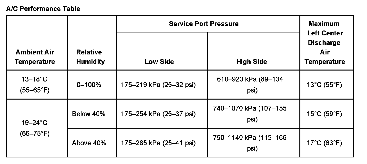 A/C System Performance Table