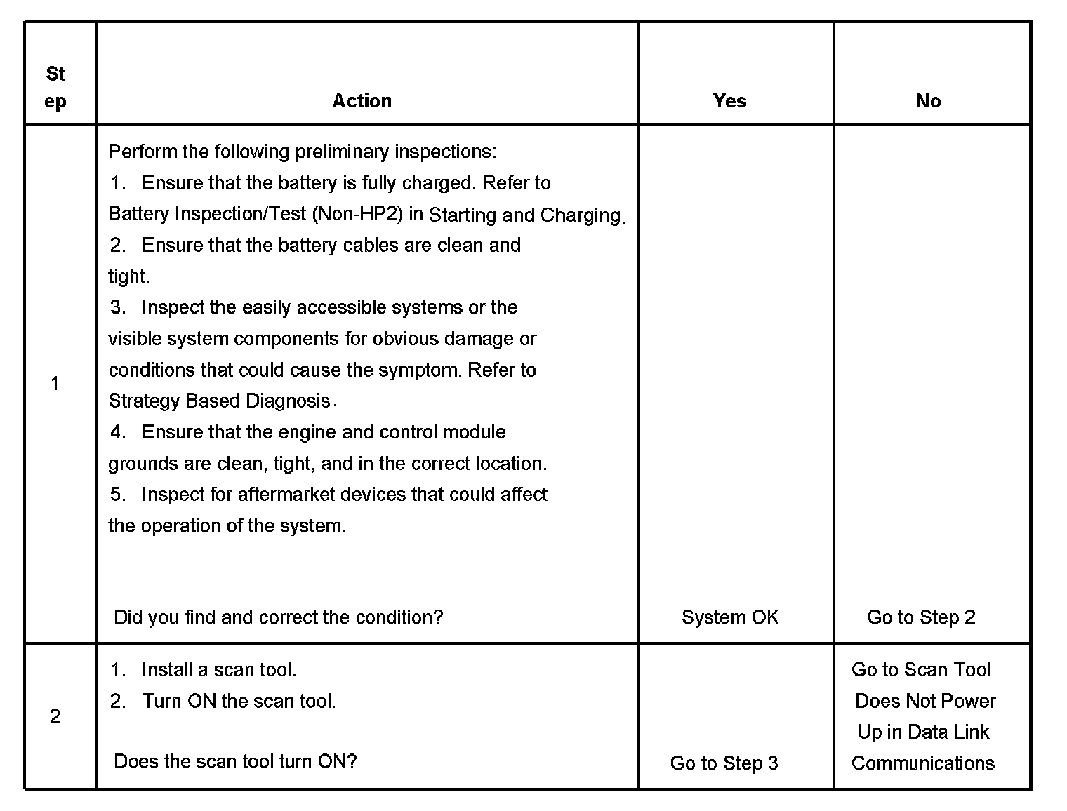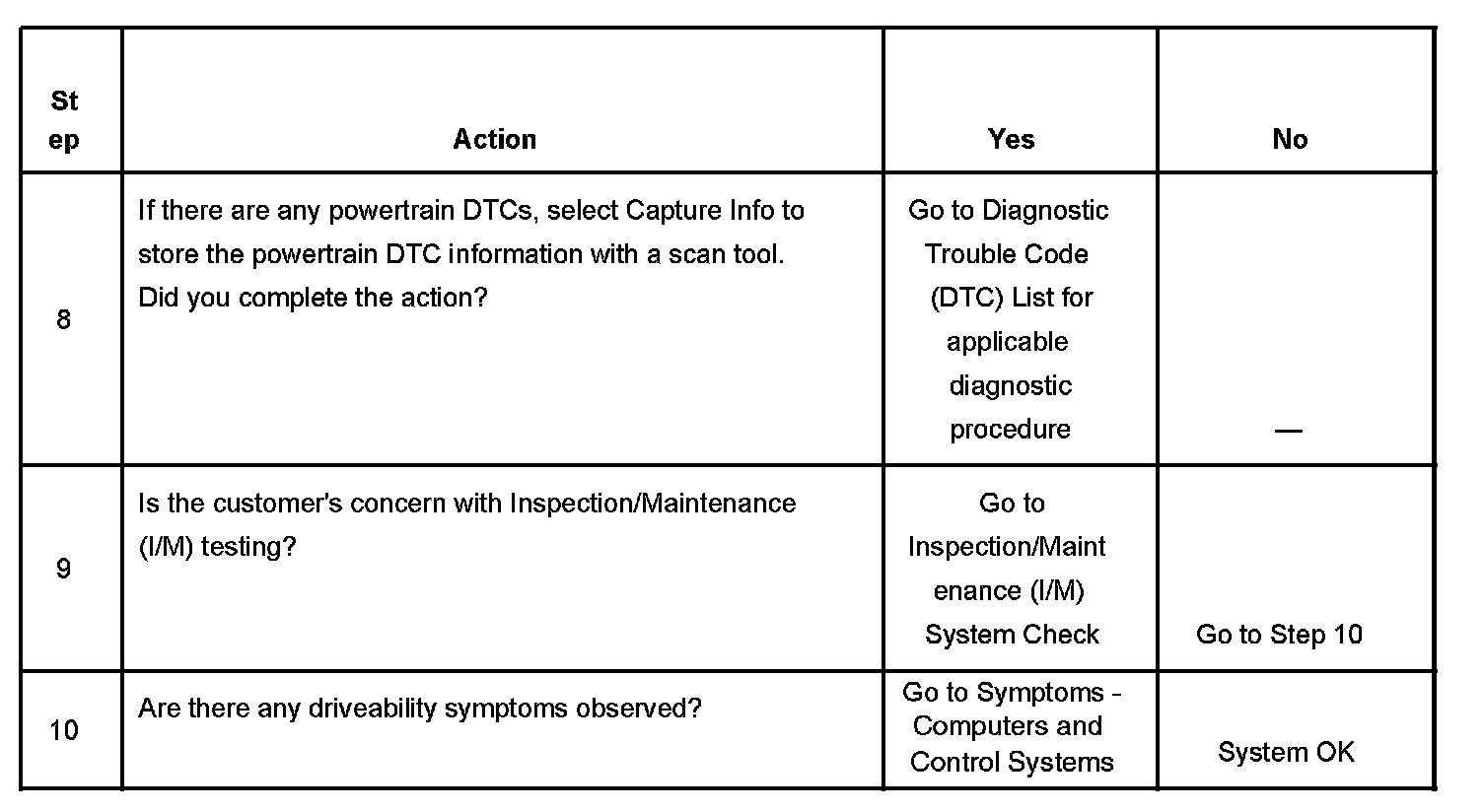 DESCRIPTIONThe Diagnostic System Check is an organized approach to identifying a condition created by an electronic engine control system malfunction. The Diagnostic System Check must be the starting point for any driveability concern. The Diagnostic System Check directs the service technician to the next logical step in diagnosing the concern. Understanding the table and using the table correctly reduces diagnostic time and prevents the replacement of good parts.