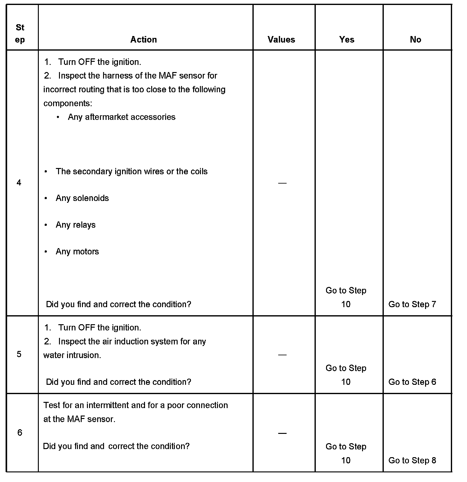 - Inspect the air induction system for any water intrusion. The water rapidly cools the hot sensing elements in the sensor causing a false indication of excessive air flow. Any water that reaches the MAF sensor will skew the sensor and may cause this DTC to set.