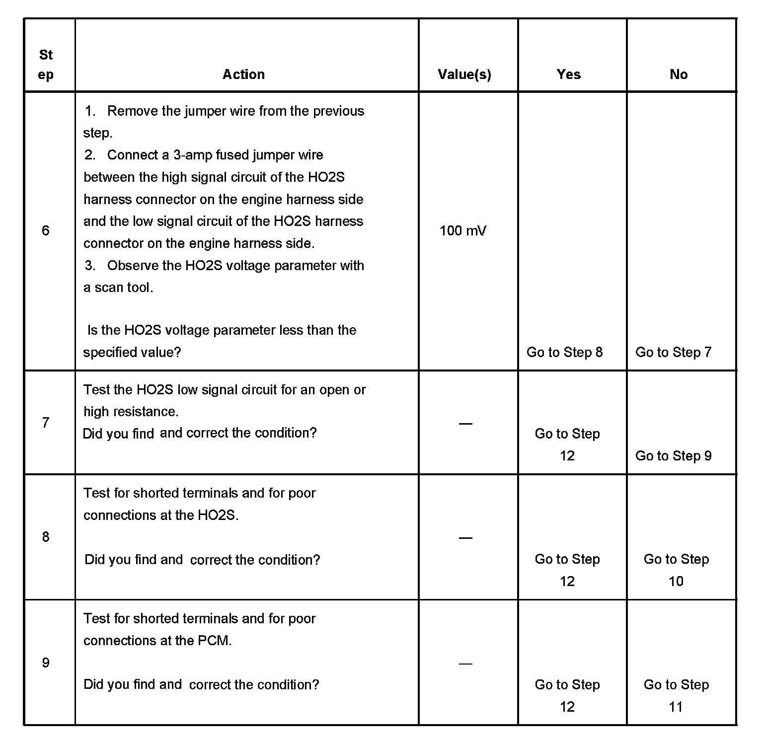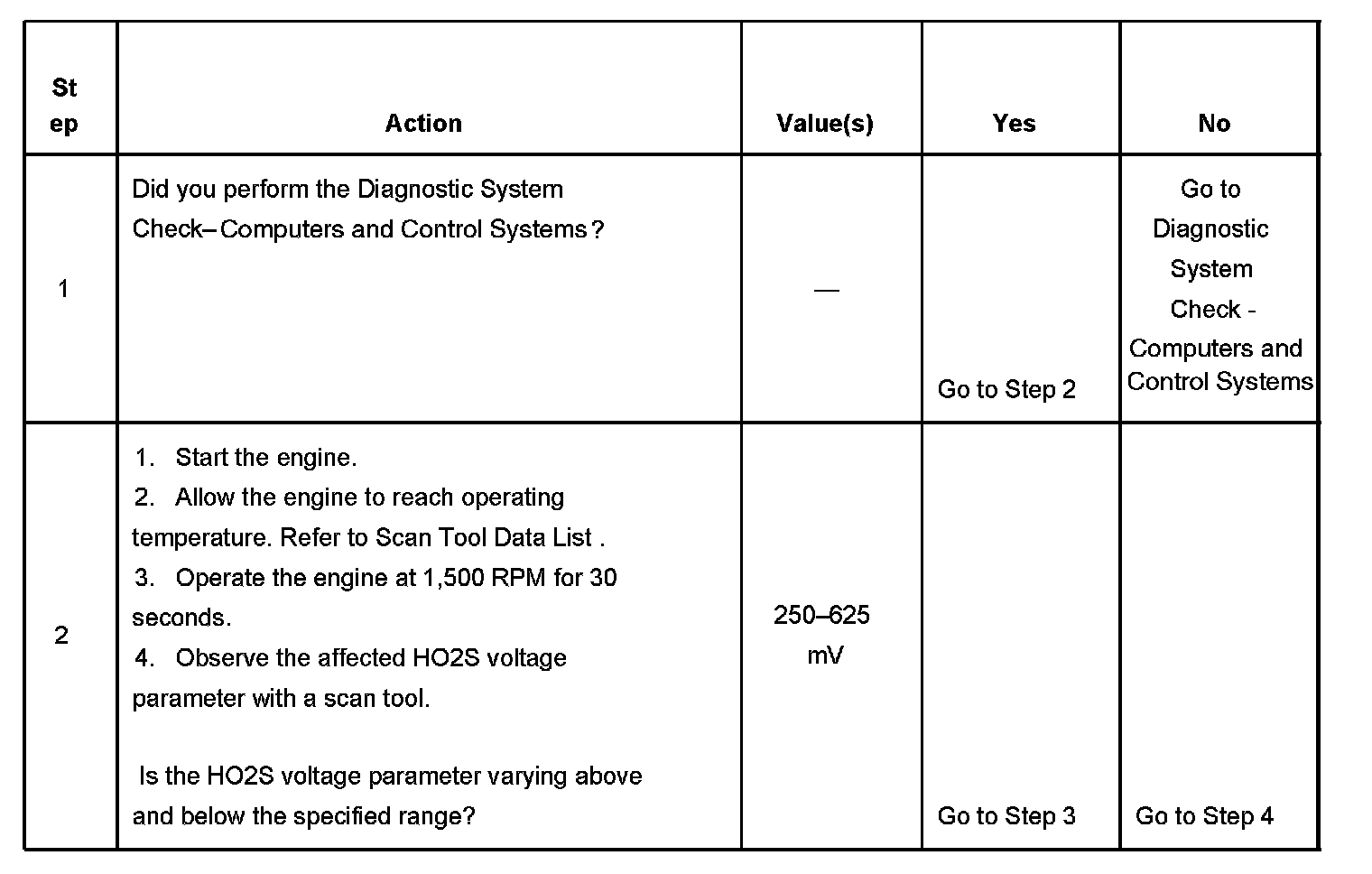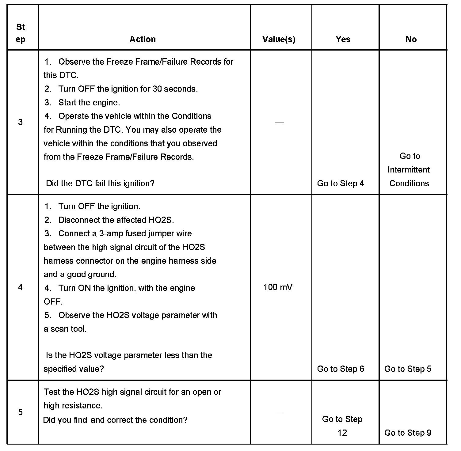 Heated oxygen sensors (HO2S) are used for fuel control and post catalyst monitoring. Each HO2S compares the oxygen content of the surrounding air with the oxygen content in the exhaust stream. The HO2S must reach operating temperature to provide an accurate voltage signal. Heating elements inside the HO2S minimize the time required for the sensors to reach operating temperature. The powertrain control module (PCM) supplies the HO2S with a reference, or bias, voltage of about 450 mV. When the engine is first started the PCM operates in open loop, ignoring the HO2S voltage signal. Once the HO2S reaches operating temperature and closed loop is achieved, the HO2S generates a voltage within a range of 0-1,000 mV that fluctuates above and below bias voltage. High HO2S voltage indicates a rich exhaust stream, low HO2S voltage indicates a lean exhaust stream. This diagnostic will only run once per ignition cycle. The PCM monitors the rich-to-lean and lean-to-rich transition time. A transition is defined as, the HO2S voltage changes from above 625 mV to below 250 mV or from below 250 mV to above 625 mV. If the PCM detects that the transition time is too long, DTC P0133 sets for HO2S bank 1 sensor 1, or DTC P0153 sets for HO2S bank 2 sensor 1.