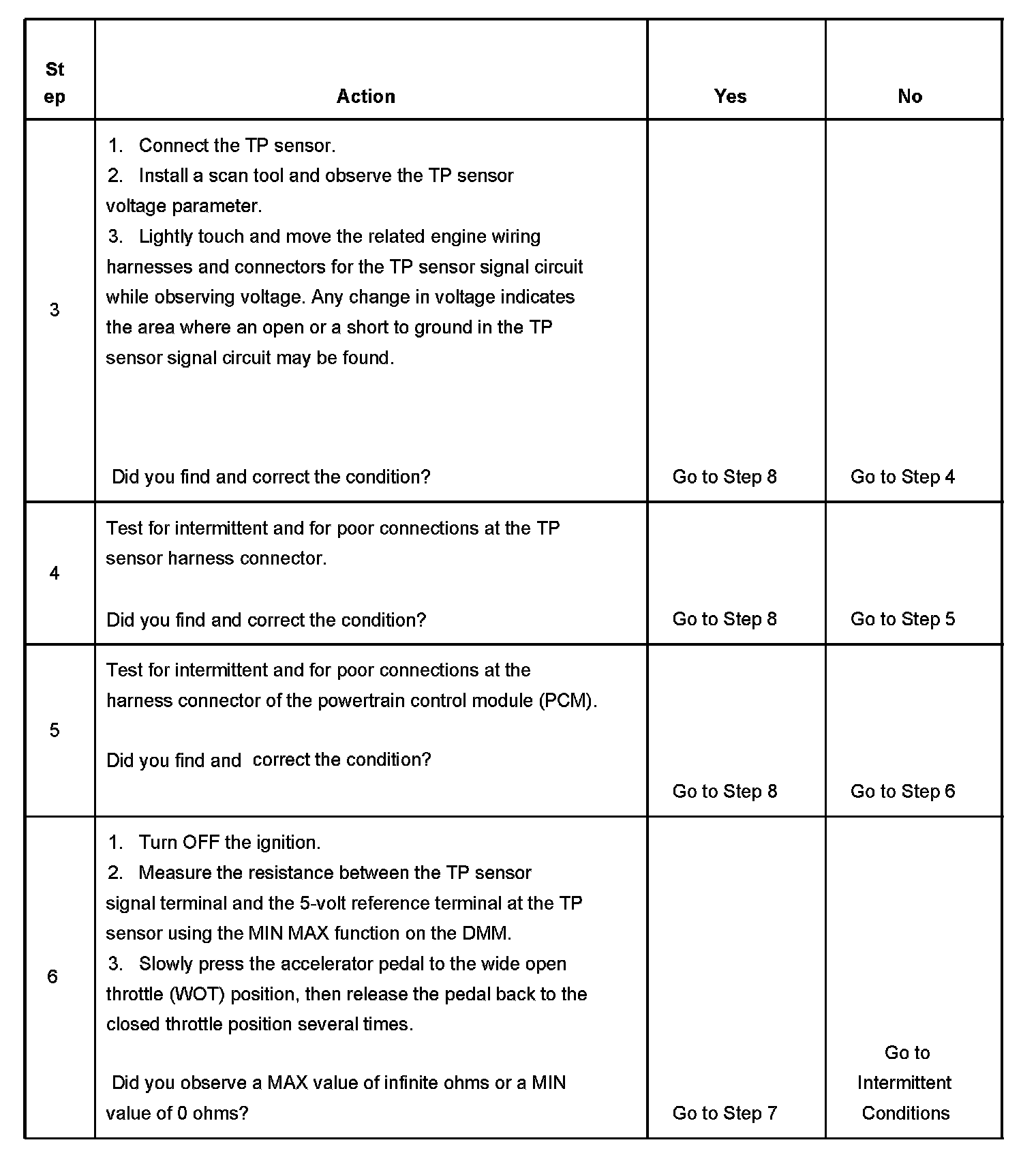 The PCM detects that the TP sensor voltage is intermittently less than 0.15 volts.