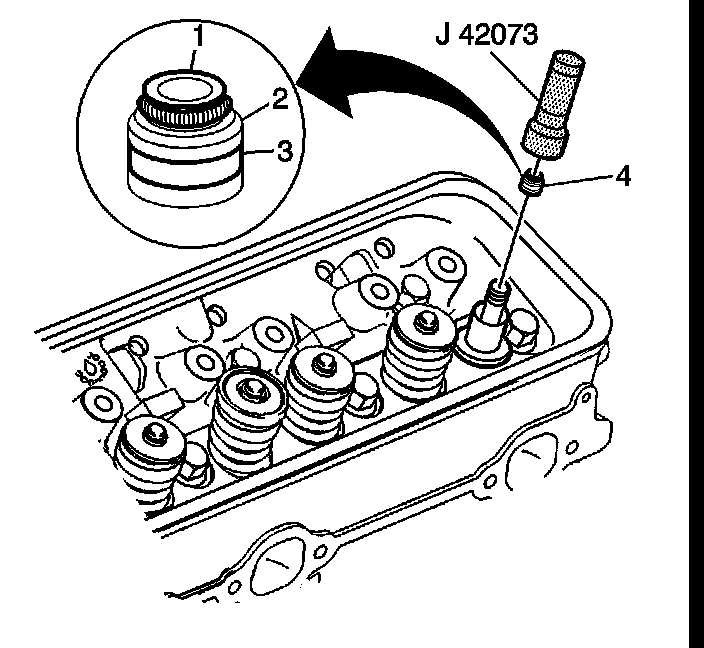 1. Tap the valve stem oil seal onto the valve guide until the J 42073 bottoms against the valve spring seat.