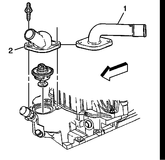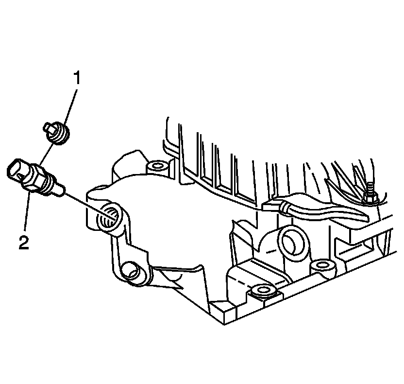 9. Remove the engine coolant temperature (ECT) sensor plug (1) or the ECT sensor (2) from the front of the lower intake manifold, if equipped.