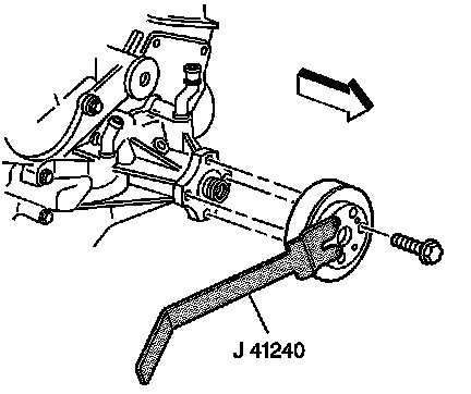 13. Using J 41240, hold the water pump pulley, remove the water pump pulley bolts.