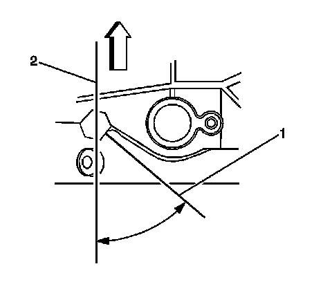 2. Increase torque until the centerline of the fitting (1) is 50 degrees from the centerline of the crankshaft (2).