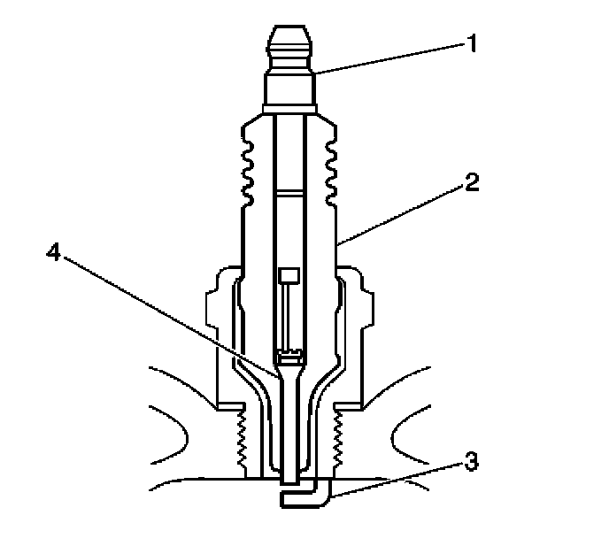 - Measure the gap between the center electrode (4) and the side electrode (3) terminals. Refer to Ignition System Specifications. An excessively wide electrode gap can prevent correct spark plug operation.