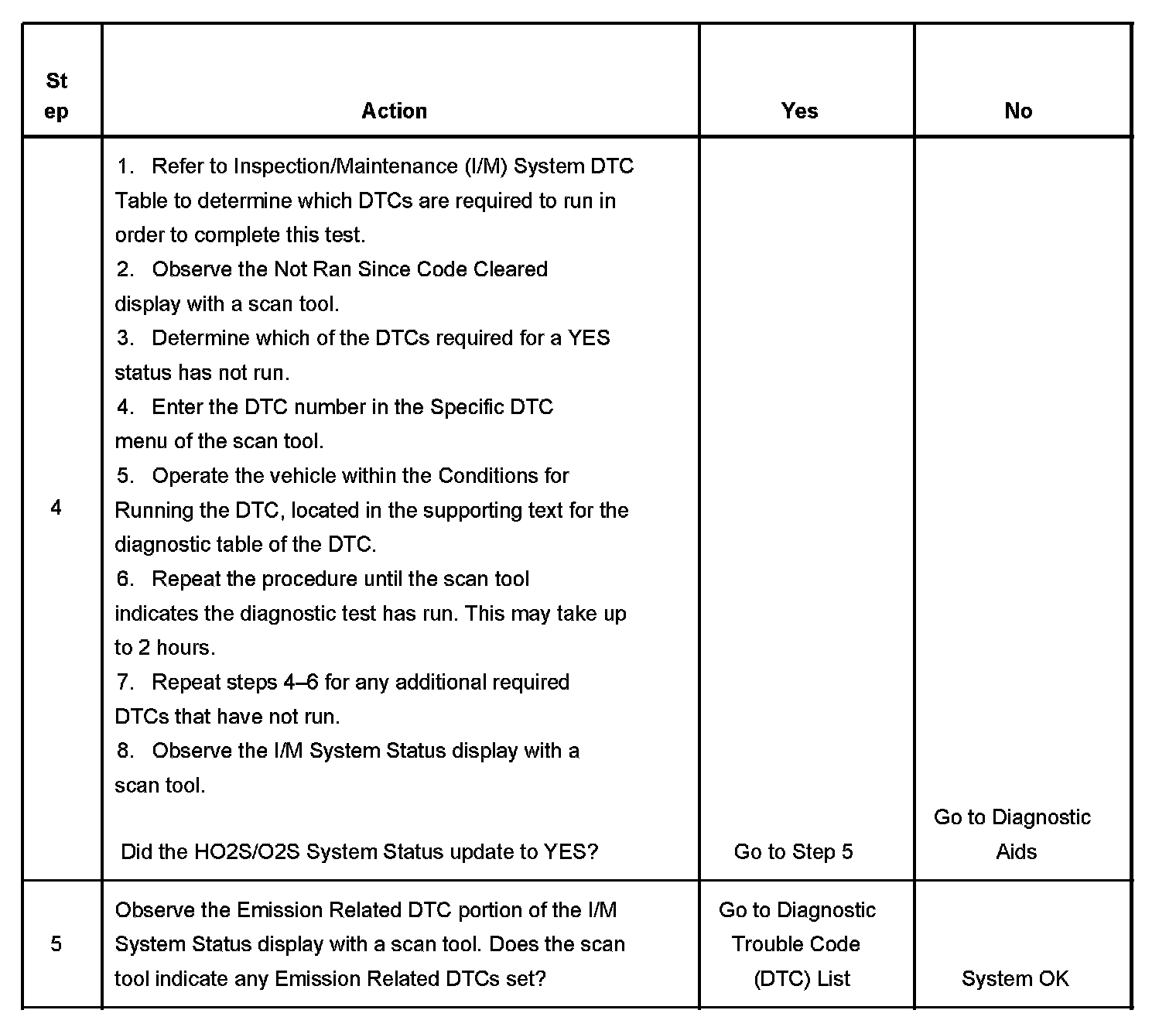 The I/M System Status Display on the scan tool provides an indication of whether the control module has completed the required tests. The I/M System Status does not indicate that the tests have passed or failed. When all of the diagnostics for a specific system have run and passed the I/M System Status will update to YES, indicating a determination was made, even if all of the other tests for that system have not run.