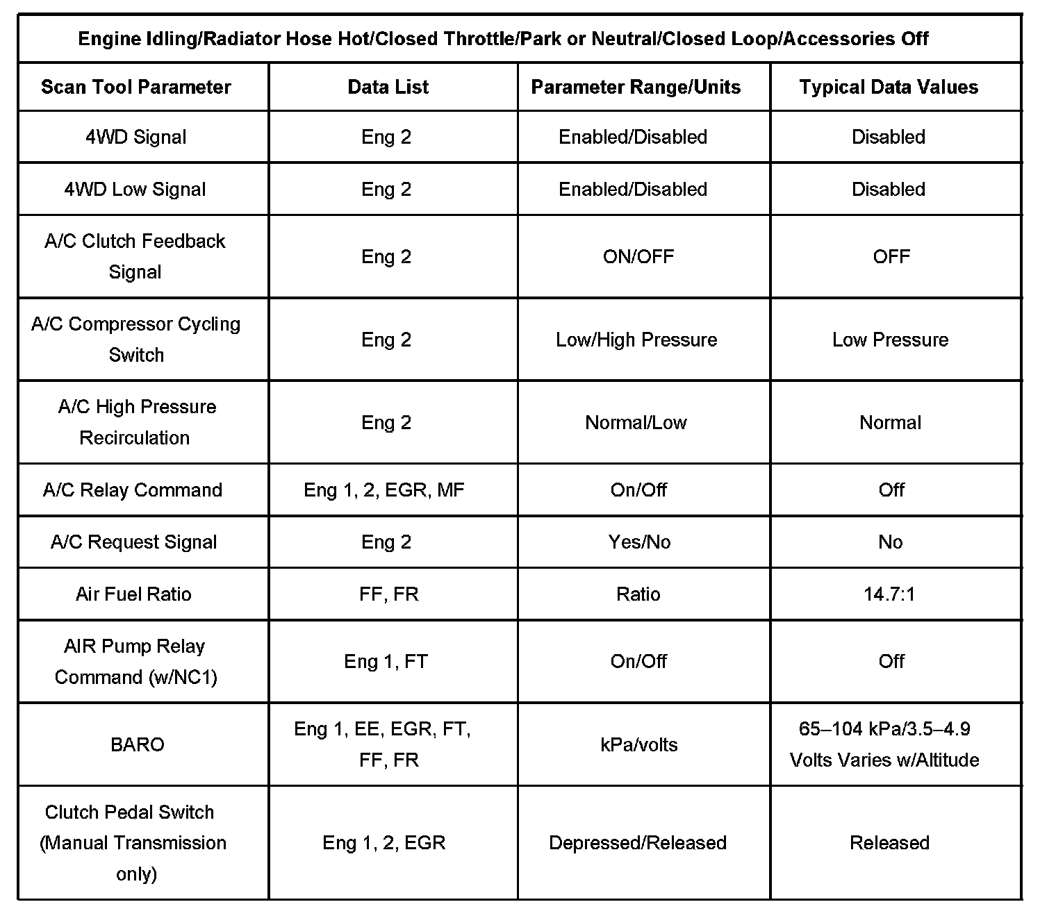 Scan tool values from a properly running engine may be used for comparison with the engine you are diagnosing. The Engine Scan Tool Data List represents values that would be seen on a normally running engine.