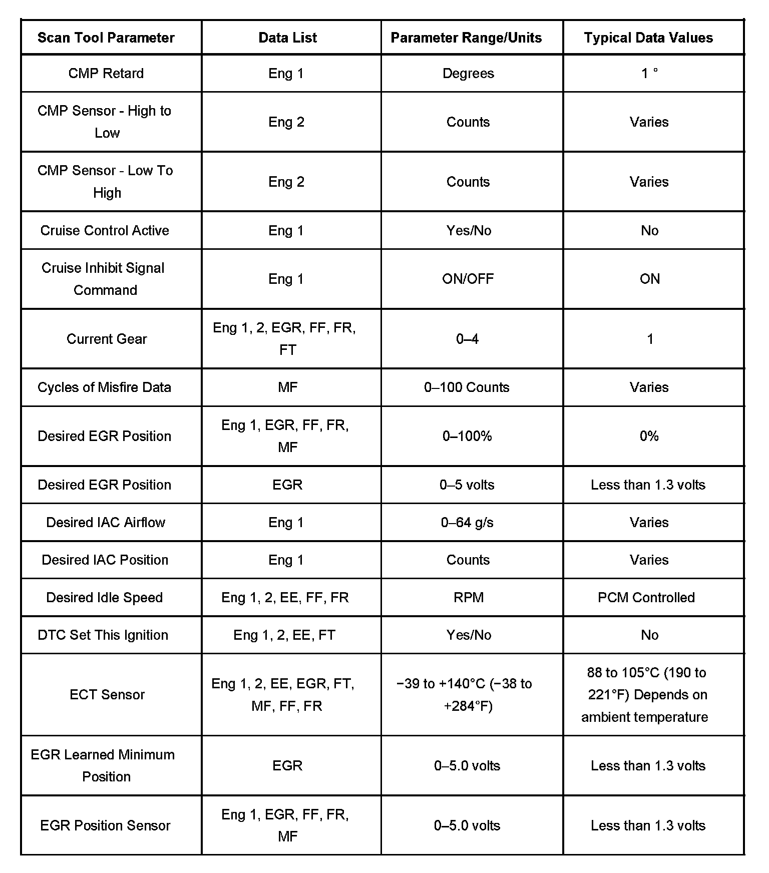 Only the parameters listed below are referenced for use in diagnosis. If all values are within the typical range described below, refer to Symptoms - Computers and Control Systems for diagnosis. Symptom Related Diagnostic Procedures