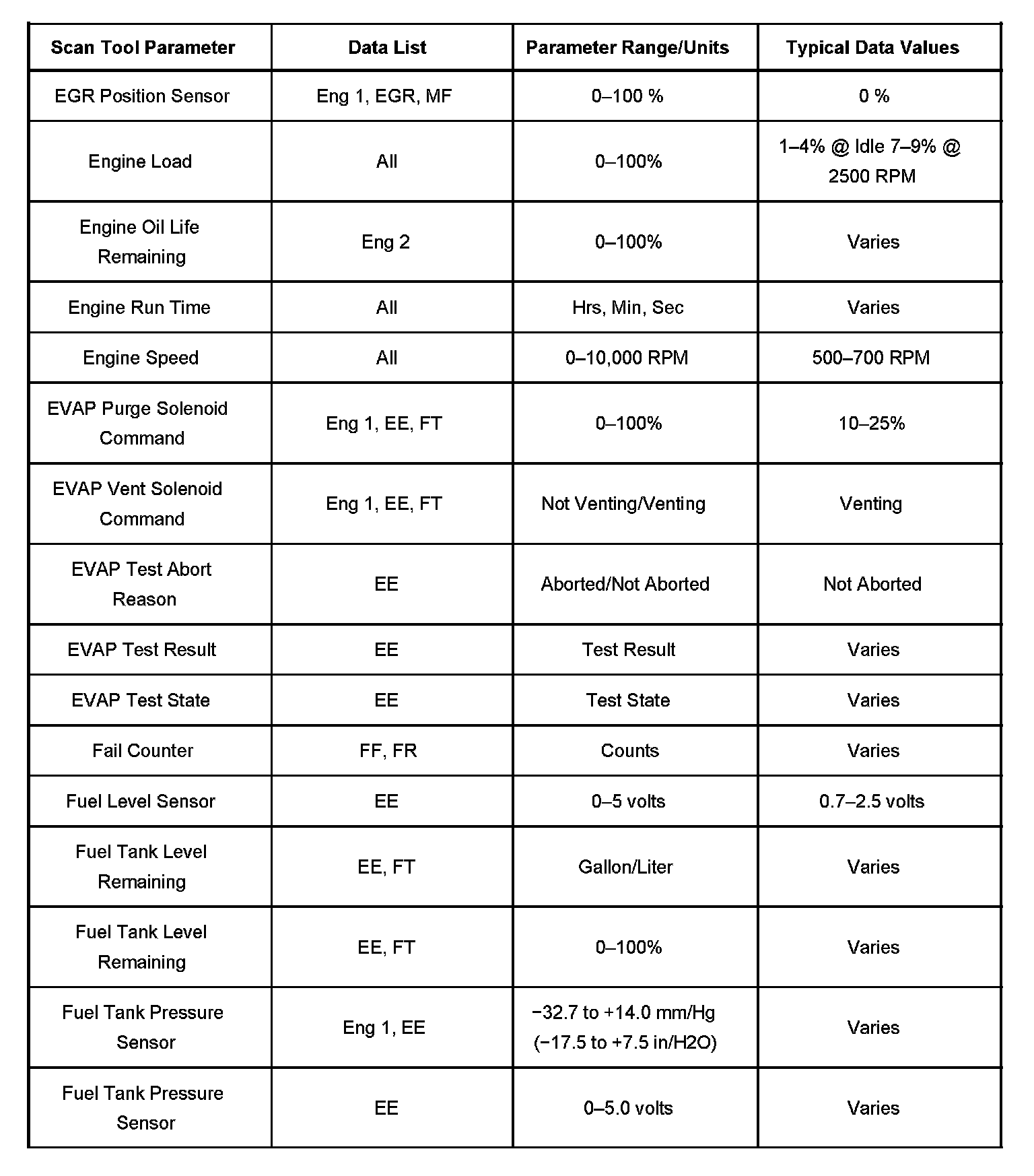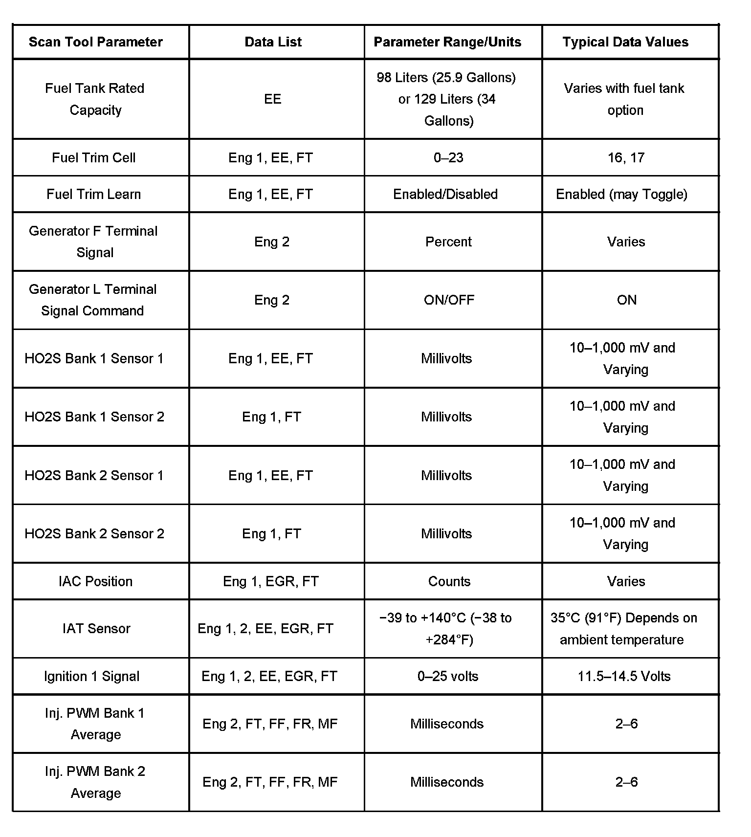 The Engine Scan Tool Data List contains all engine related parameters that are available on the scan tool. The list is arranged in alphabetical order. A given parameter may appear in any one of the data lists, and in some cases may appear more than once, or in more than one data list in order to group certain related parameters together.