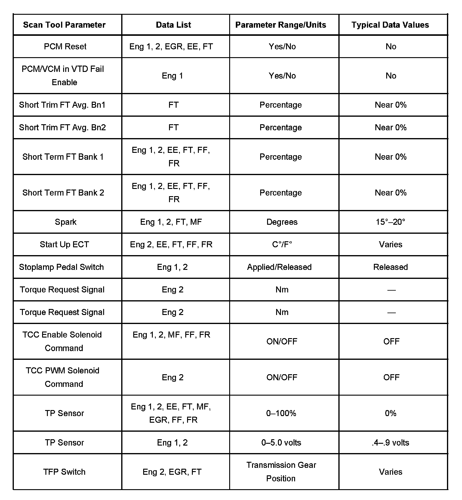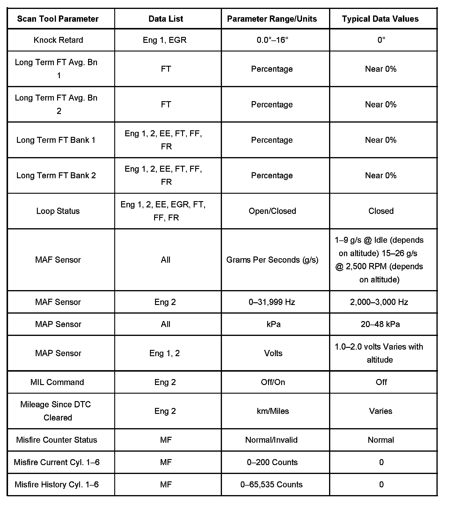The column labeled Data List indicates where a parameter can be located on the scan tool. Refer to the scan tool operating manual for the exact locations of the data lists. The following is a description of each term listed: