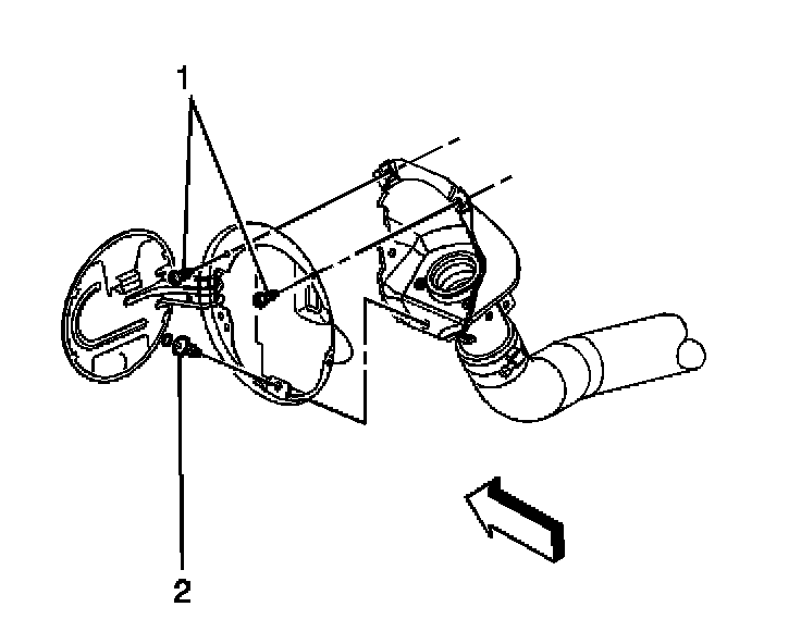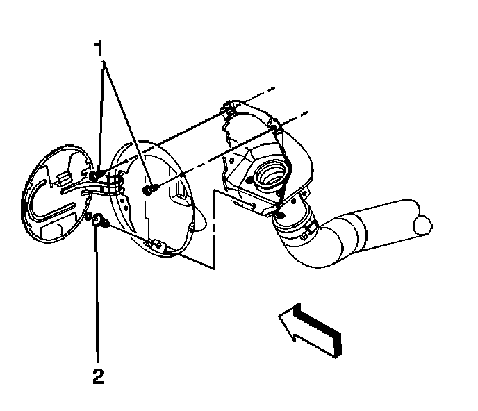 3. Remove the fuel tank filler housing to body screws (1) and retainer (2).