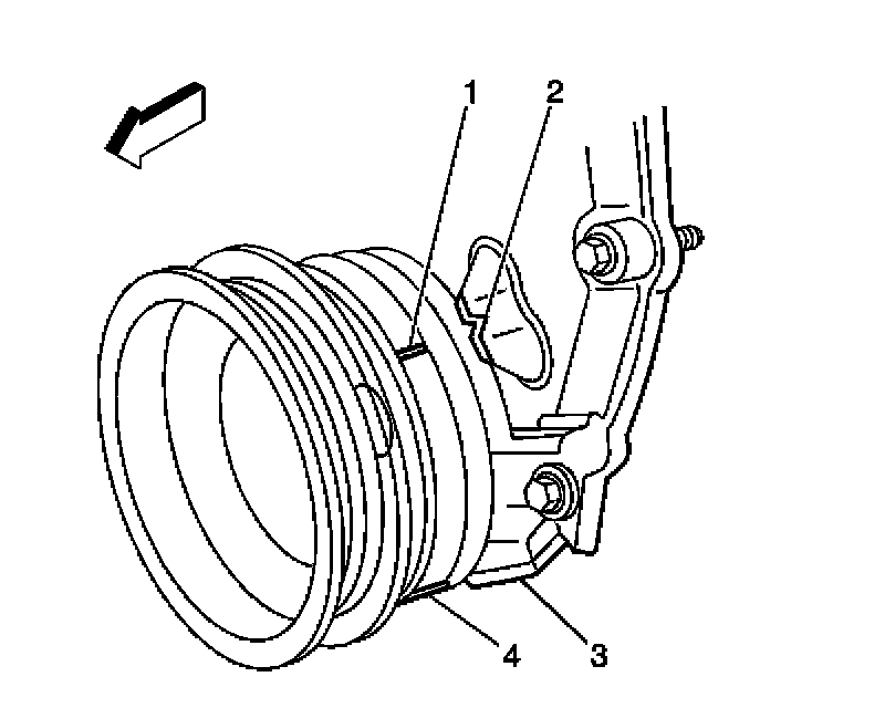 IMPORTANT: Rotate the number 1 cylinder to top dead center (TDC) of the compression stroke. The engine front cover has 2 alignment tabs and the crankshaft balancer has 2 alignment marks (spaced 90 degrees apart) which are used for positioning the number 1 piston at TDC. With the piston on the compression stroke and at TDC, the crankshaft balancer alignment mark (1) must align with the engine front cover tab (2) and the crankshaft balancer alignment mark (4) must align with the engine front cover tab (3).