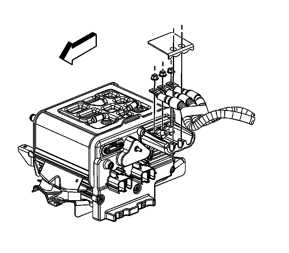 66. Position the harness ground (2) and auxiliary negative battery cable, if equipped, to the block.