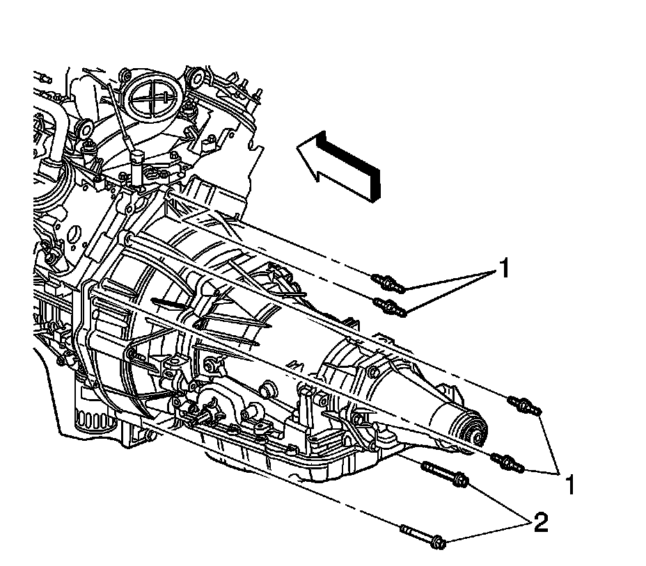 20. Install the transmission studs (1) and bolts (2).
