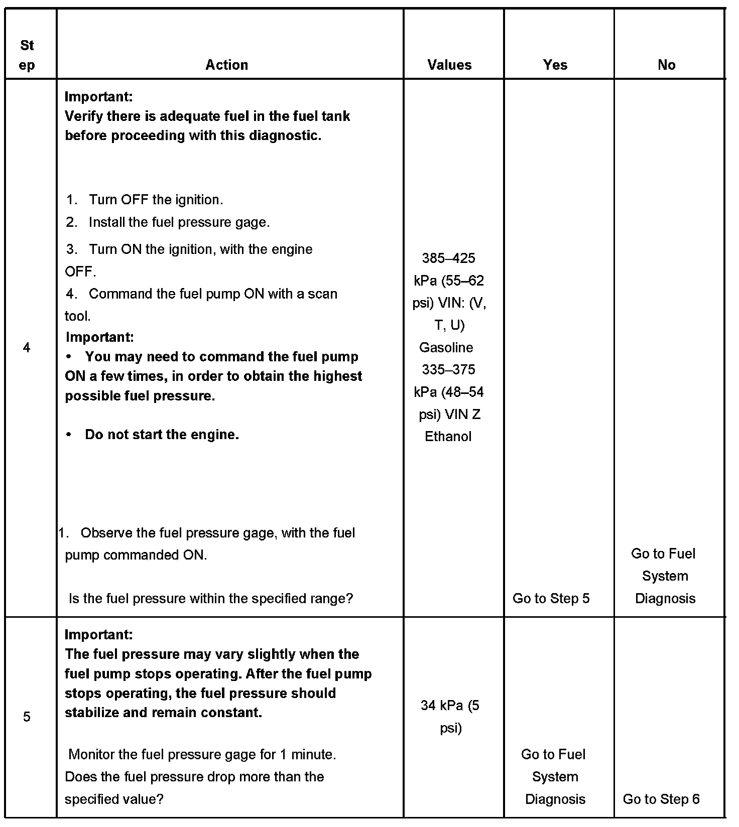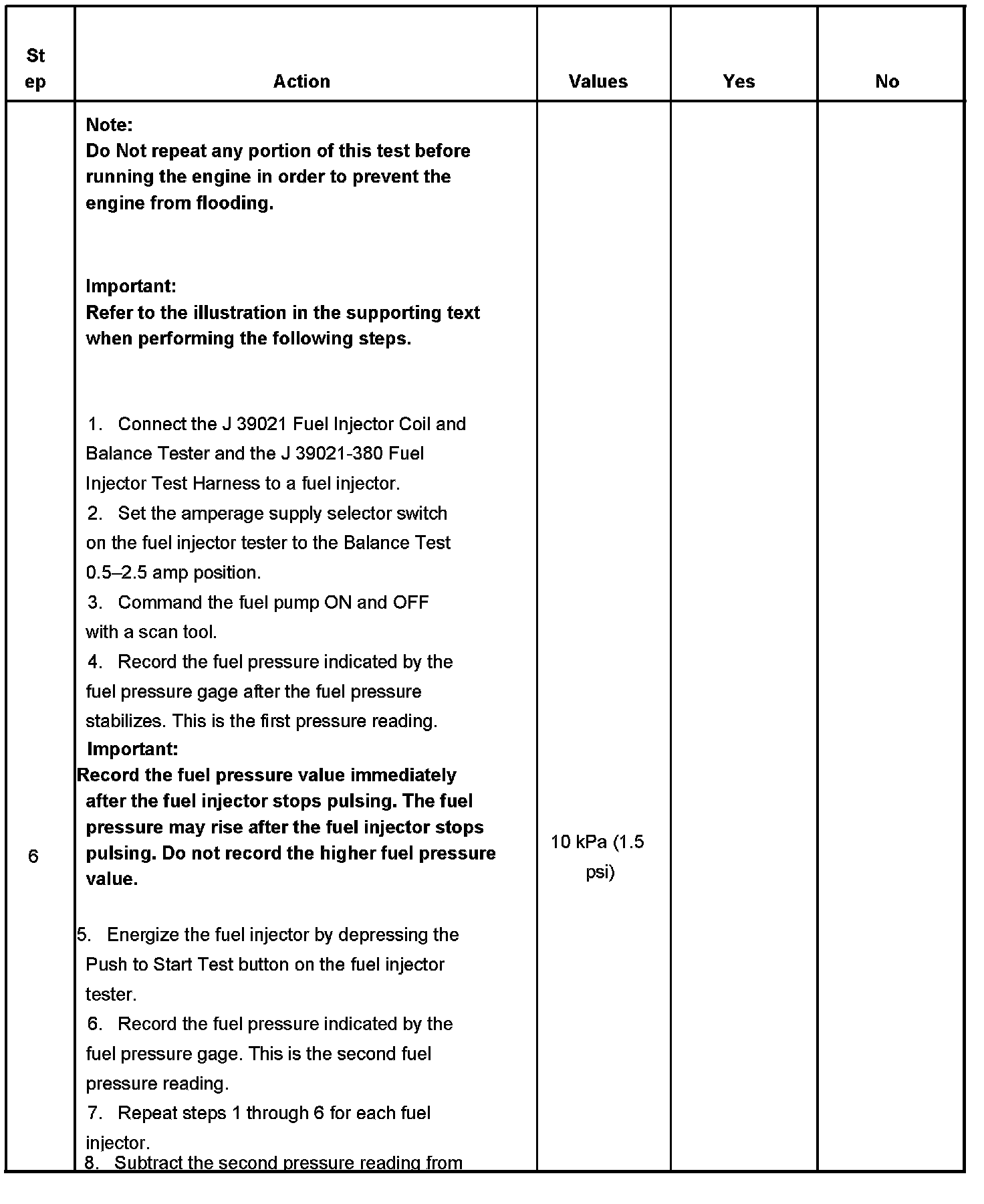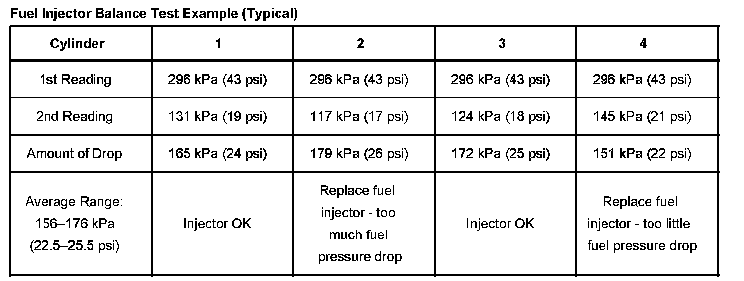 6. If the pressure drop value for each fuel injector is within 10 kPa (1.5 psi) of the average pressure drop value, the fuel injectors are flowing properly. Calculate the pressure drop value for each fuel injector by subtracting the second pressure reading from the first pressure reading. Refer to the illustration.