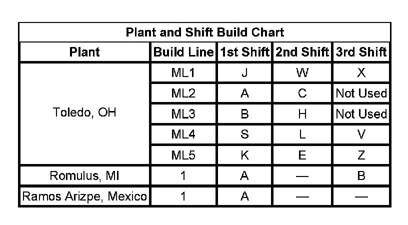 12 - Build Location Y = Toledo, OH, R = Romulus, MI, 4 = Ramos Arizpe, Mexico