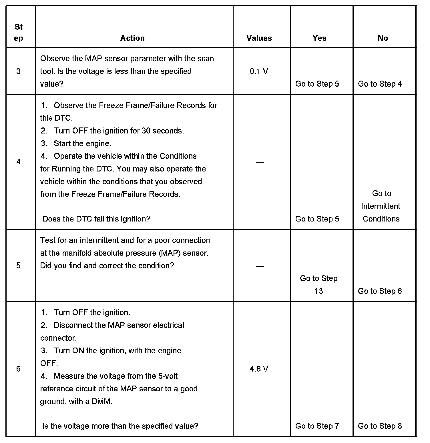 The PCM detects that the MAP sensor voltage is less than 0.10 volt for more than 4 seconds.