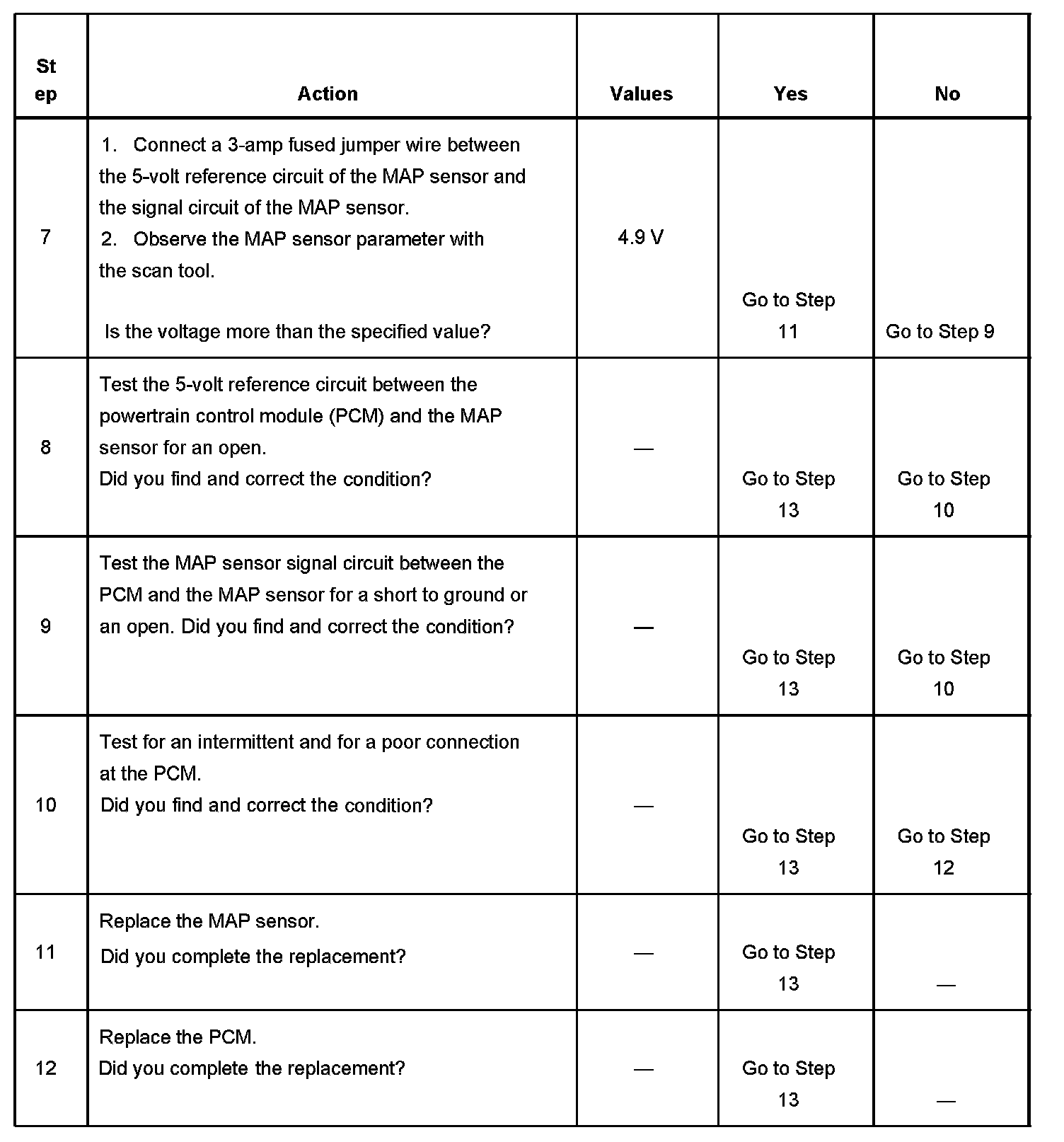 The PCM should detect a high signal voltage at a high MAP, such as the ignition is ON, with the engine OFF, or at a wide open throttle (WOT). The MAP sensor is also used in order to determine the barometric pressure (BARO). This occurs when the ignition switch is turned ON, with the engine OFF. The BARO reading may also be updated whenever the engine is operated at WOT. The PCM monitors the MAP sensor signal for voltage outside of the normal range.