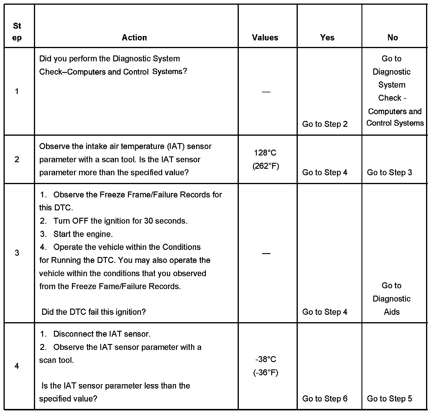 The PCM detects that the IAT Sensor parameter is more than 128°C (262°F) for 5 seconds.