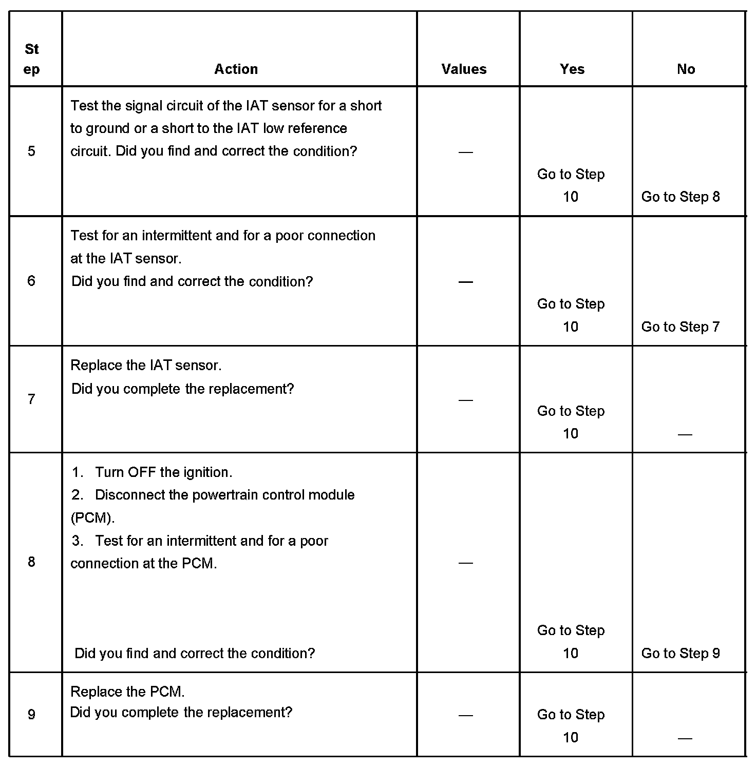 The intake air temperature (IAT) sensor is a variable resistor. The IAT sensor has a signal circuit and a low reference circuit. The IAT sensor measures the temperature of the air entering the engine. The powertrain control module (PCM) supplies 5 volts to the IAT signal circuit and a ground for the IAT low reference circuit. When the IAT sensor is cold, the sensor resistance is high. When the air temperature increases, the sensor resistance decreases. With high sensor resistance, the PCM detects a high voltage on the IAT signal circuit. With lower sensor resistance, the PCM detects a lower voltage on the IAT signal circuit. If the PCM detects an excessively low IAT signal voltage, indicating a high temperature, DTC P0112 sets.