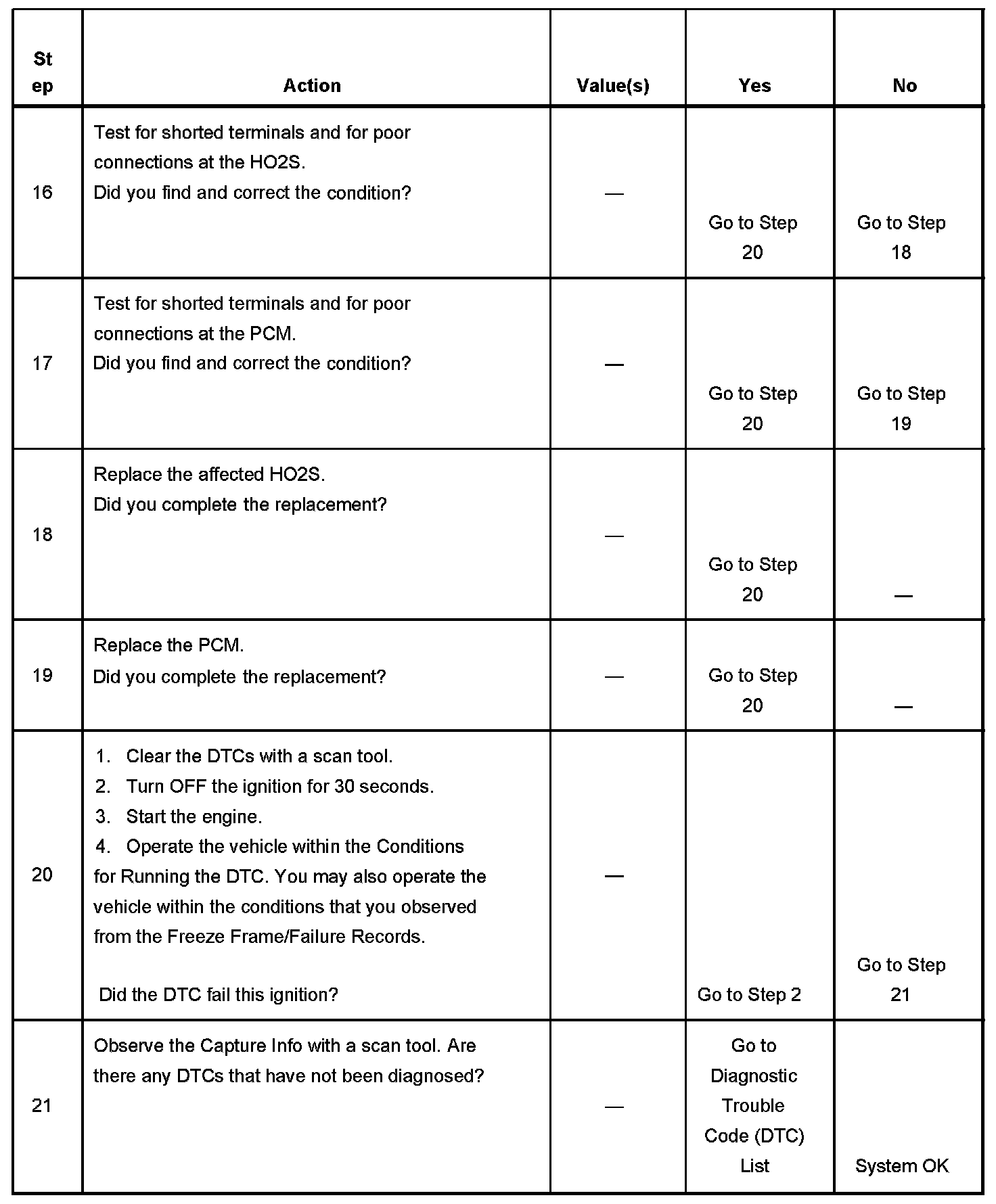 Heated oxygen sensors (HO2S) are used for fuel control and post catalyst monitoring. Each HO2S compares the oxygen content of the surrounding air with the oxygen content in the exhaust stream. The HO2S must reach operating temperature to provide an accurate voltage signal. Heating elements inside the HO2S minimize the time required for the sensors to reach operating temperature. The powertrain control module (PCM) supplies the HO2S with a reference, or bias, voltage of about 450 mV. When the engine is first started the PCM operates in Open Loop, ignoring the HO2S voltage signal. Once the HO2S reaches operating temperature and Closed Loop is achieved, the HO2S generates a voltage within a range of 0-1,000 mV that fluctuates above and below bias voltage. High HO2S voltage indicates a rich exhaust stream; low HO2S voltage indicates a lean exhaust stream. If the PCM detects an HO2S voltage that stays below a specified value, DTC P0137 sets for HO2S bank 1 sensor 2 or DTC P0157 sets for HO2S bank 2 sensor 2.