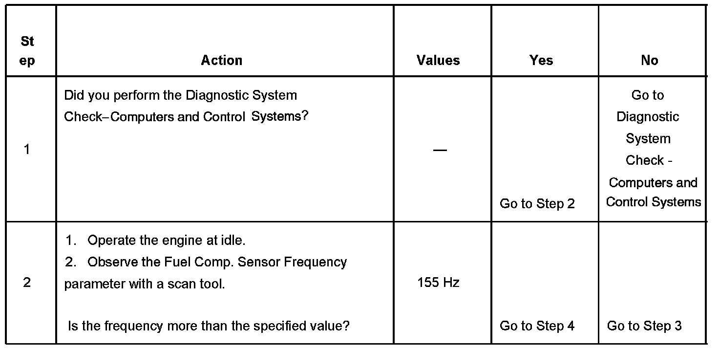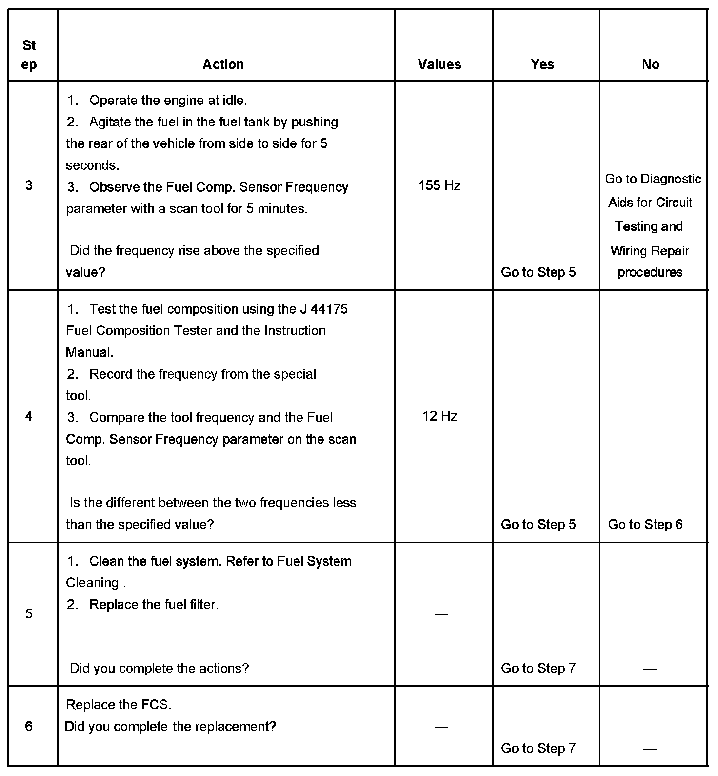 The FCS uses a microprocessor inside the sensor to measure the ethanol percentage and fuel temperature and changes output signals accordingly. The signal circuit carries both the ethanol percentage and the fuel temperature within the same signal. The signal is both variable frequency and variable pulse width. The frequency signal indicates the ethanol percentage and the pulse width indicates fuel temperature. The PCM provides an internal pull up to 5 volts on the signal circuit and the FCS pulls the 5 volts to ground in pulses. The normal range of operating frequency is between 50 and 150 hertz. The normal pulse width ranges between 1 and 5 milliseconds. The microprocessor inside the sensor is capable of a certain amount of self-diagnosis. An output frequency of 170 hertz indicates that the fuel is contaminated or an internal sensor fault has been detected. If the PCM detects a signal more than 155 hertz, DTC P0179 will set.