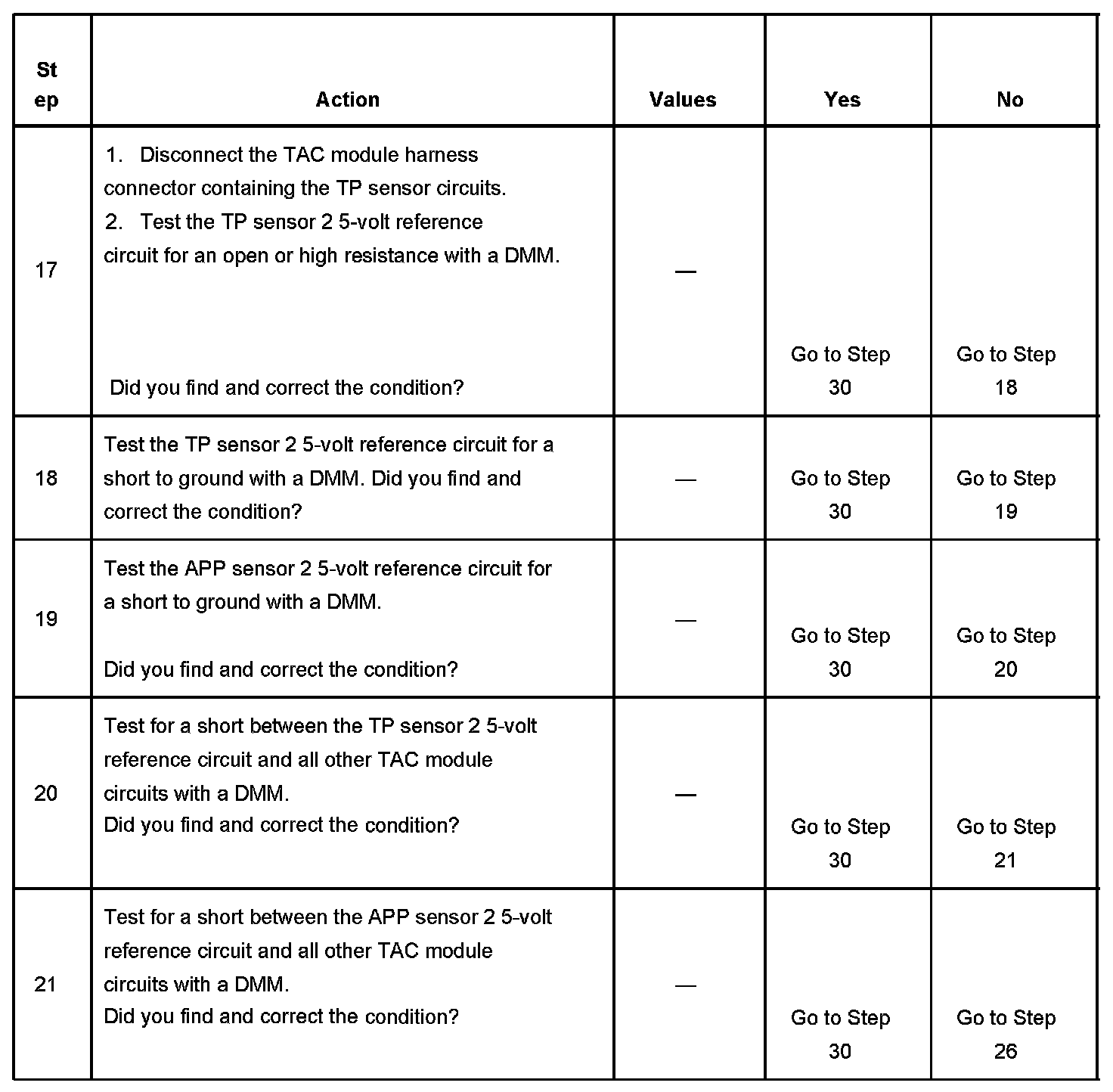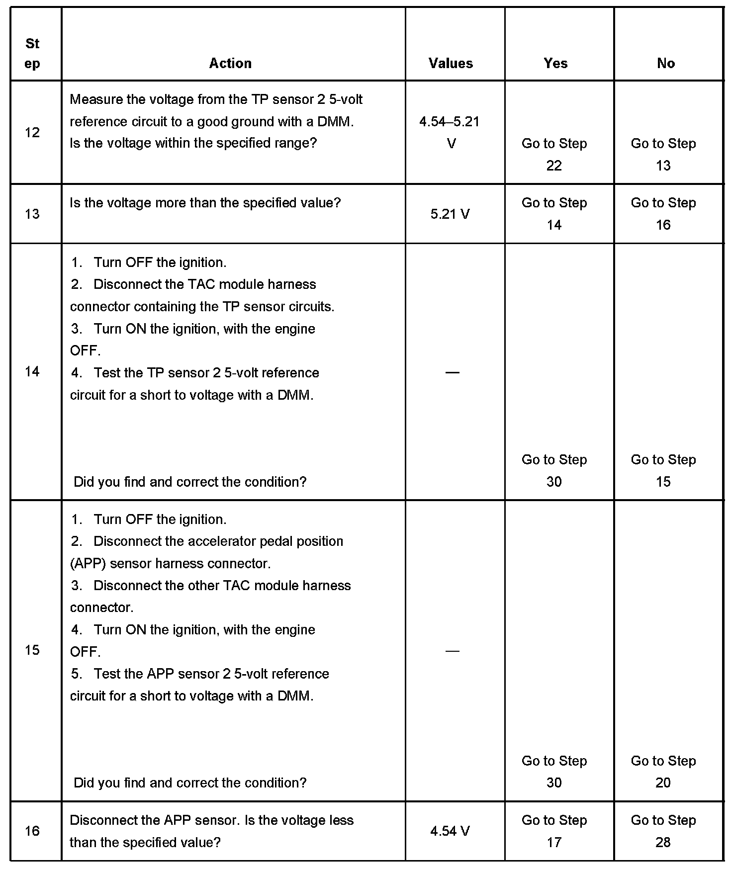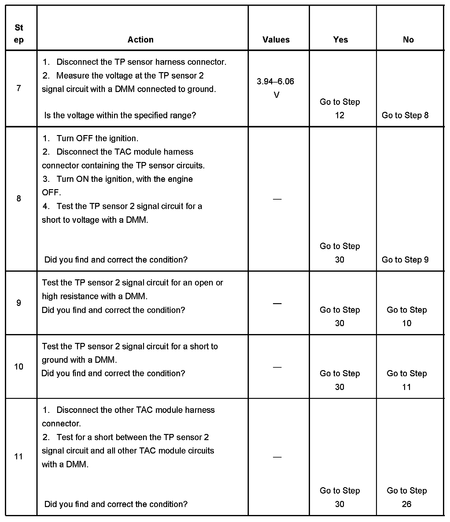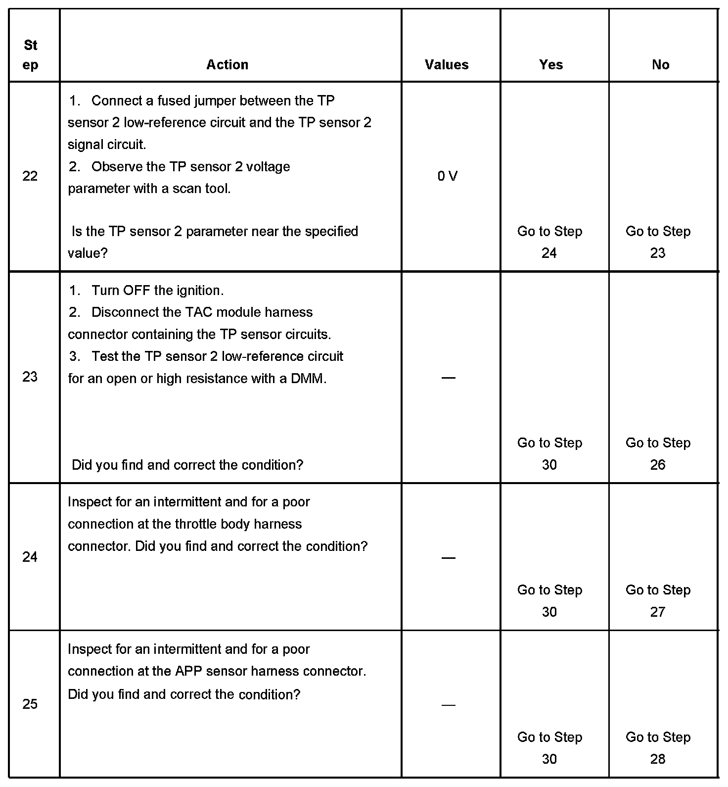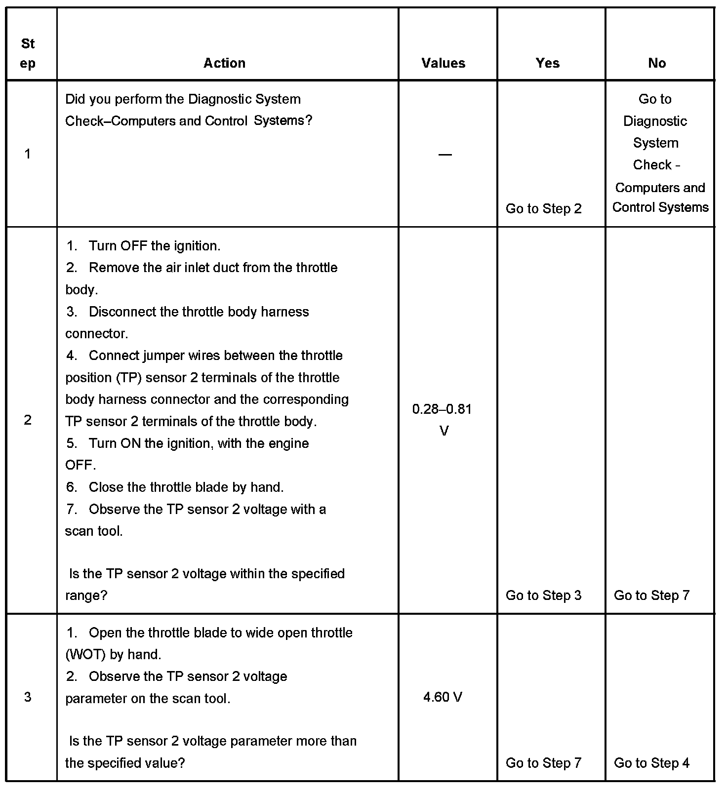 - The TP sensor 2 voltage is less than 0.28 volt or greater than 4.60 volts.