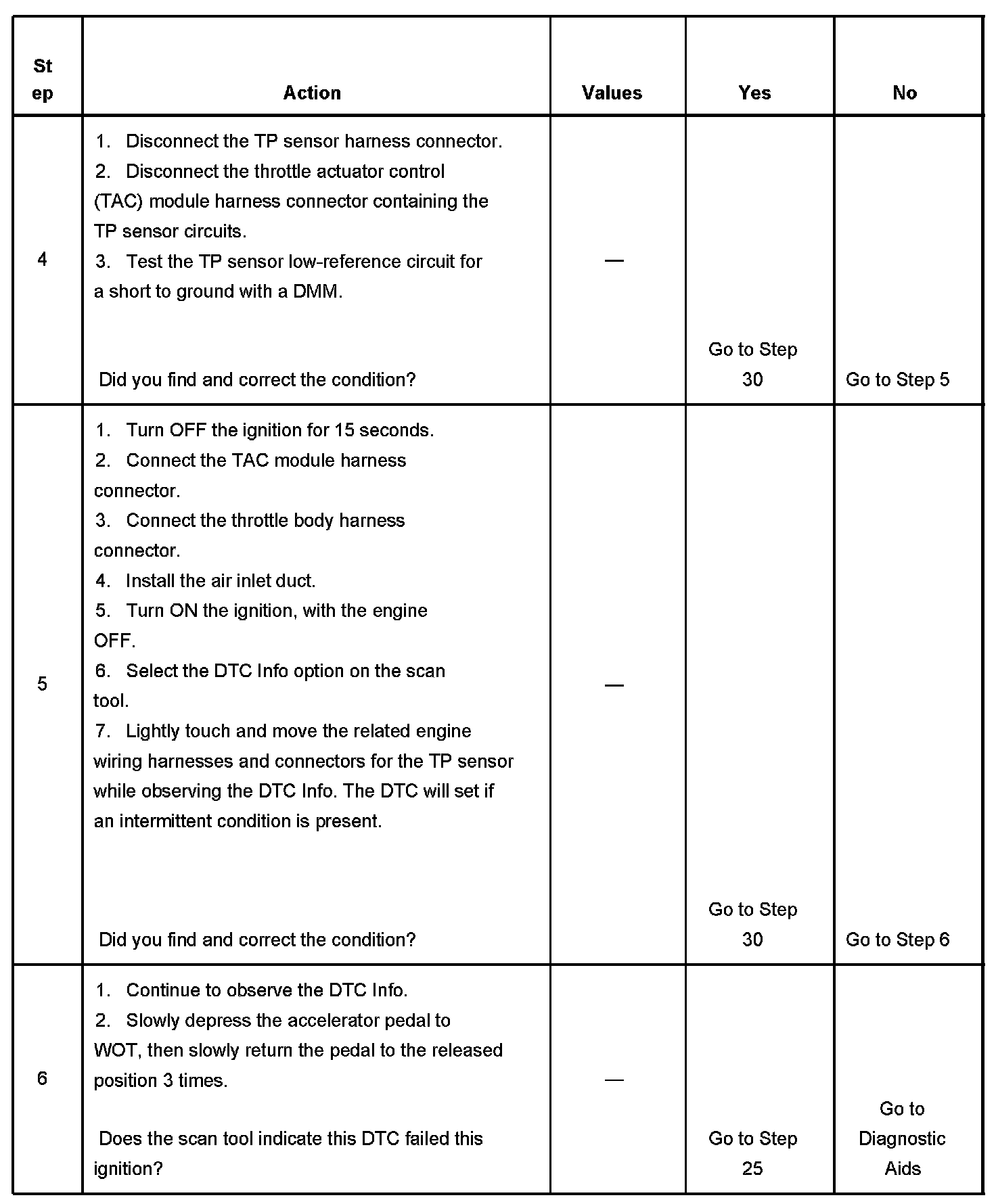The TP sensor is used to determine the throttle plate angle for various engine management systems. The control module provides the TP sensor a 5-volt reference circuit and a low reference circuit. The TP sensor then provides the control module a signal voltage proportional to throttle plate movement. The TP sensor 1 signal voltage is low at closed throttle and increases as the throttle opens. When the control module detects that the TP sensor 2 signal or the TP sensor 5-volt reference voltage is outside the predetermined range, this DTC sets.