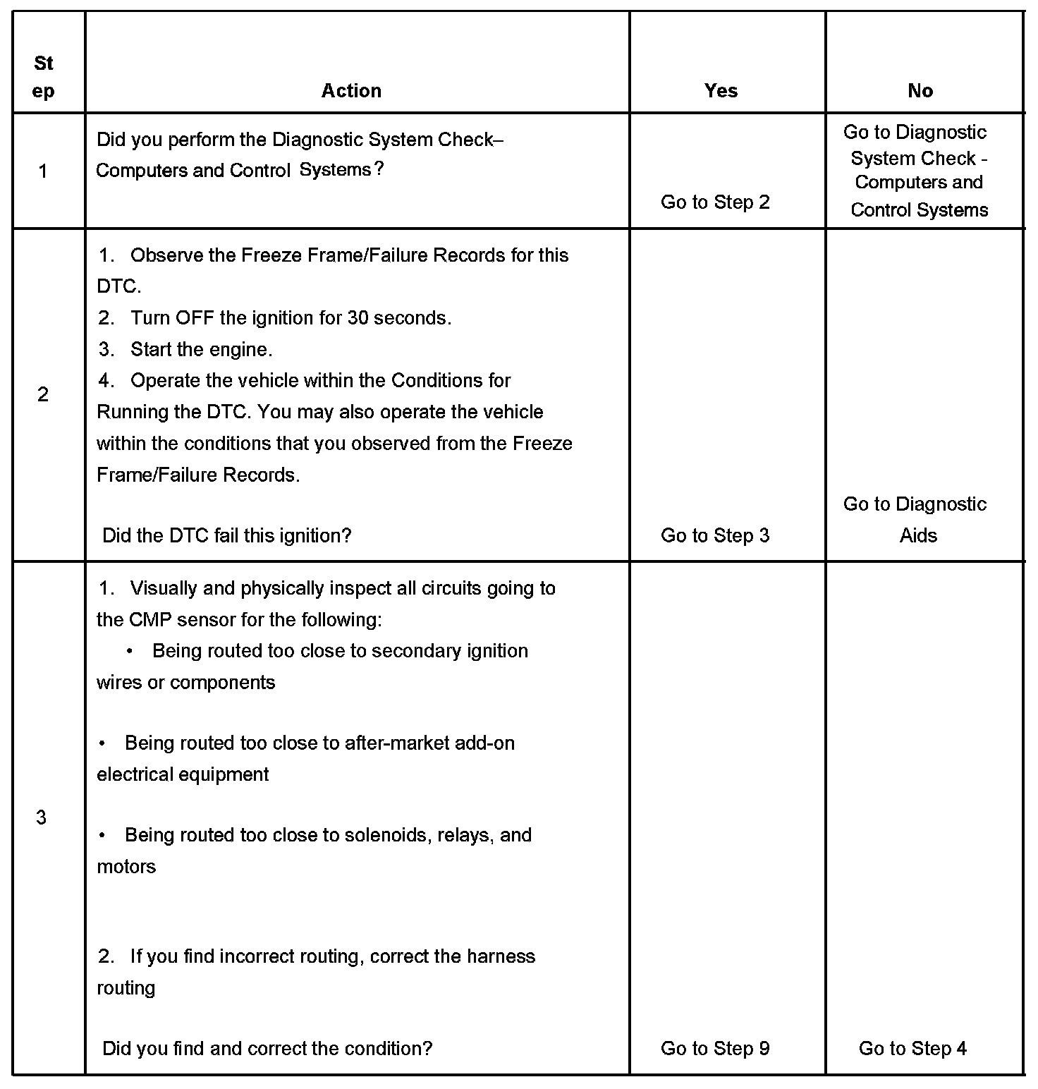 The CMP sensor 1 X signal is used by the PCM to determine if the cylinder at top dead center (TDC) is on the firing stroke or the exhaust stroke. The PCM can determine TDC for all cylinders by using the CKP sensor 24 X signal alone. The engine will start without a CMP signal as long as the PCM receives the CKP sensor 24 X signal. A slightly longer cranking time may be a symptom of this condition. The system attempts synchronization and looks for an increase in engine speed indicating that the engine started. If the PCM does not detect an increase in engine speed, the PCM assumes that the PCM incorrectly synchronized to the exhaust stroke and re-syncs to the opposite cam position. If the PCM detects that a CMP to CKP mis-match has occurred DTC P0341 sets.